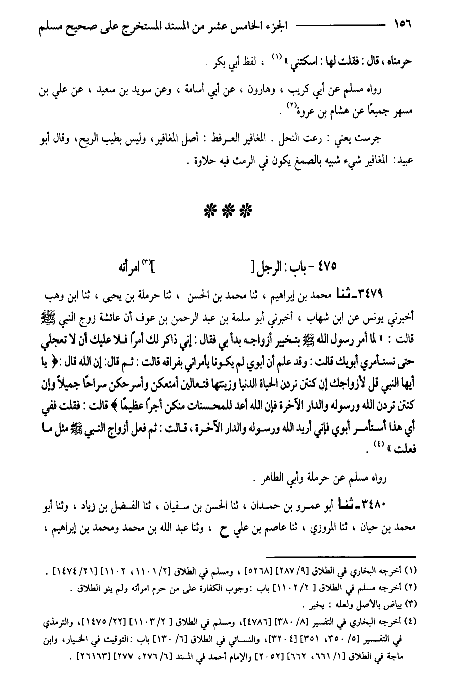 3479 - ثَنَا مُحَمَّدُ بْنُ إِبْرَاهِيمَ ثَنَا مُحَمَّدُ بْنُ الْحَسَنِ ثَنَا حَرْمَلَةُ بْنُ يَحْيَى ثَنَا ابْنُ وَهْبٍ أَخْبَرَنِي يُونُسُ عَنِ ابْنِ شِهَابٍ أَخْبَرَنِي أَبُو سَلَمَةَ بْنُ عَبْدِ الرَّحْمَنِ بْنِ عَوْفٍ أَنَّ عَائِشَةُ زَوْجُ النَّبِيِّ صَلَّى اللَّهُ عَلَيْهِ وَسَلَّمَ قَالَتْ (لَمَّا أَمَرَ رَسُولُ اللَّهِ صَلَّى اللَّهُ عَلَيْهِ وَسَلَّمَ بِتَخْيِيرِ أَزْوَاجِهِ بَدَأَ بِي فَقَالَ إِنِّي ذَاكِرٌ لَكِ أَمْرًا فَلا عَلَيْكِ أَنْ لَا تَعْجَلِي حَتَّى تَسْتَأْمِرِي أَبَوَيْكِ قَالَتْ وَقَدْ عَلِمَ أَنَّ أَبَوَيَّ لَمْ يَكُونَا يَأْمُرَانِي بِفِرَاقِهِ قَالَتْ ثُمَّ قَالَ إِن الله قَالَ {يَا أَيهَا النَّبِيُّ قُلْ لأَزْوَاجِكَ إِنْ كُنْتُنَّ تُرِدْنَ الْحَيَاةَ الدُّنْيَا وَزِينَتَهَا فَتَعَالَيْنَ أُمَتِّعْكُنَّ وَأُسَرِّحْكُنَّ سَرَاحًا جَمِيلا وَإِنْ كُنْتُنَّ تُرِدْنَ اللَّهَ وَرَسُولَهُ وَالدَّارَ الآخِرَةَ فَإِنَّ اللَّهَ أَعَدَّ لِلْمُحْسِنَاتِ مِنْكُن أجرا عَظِيما} قَالَتْ فَقُلْتُ فَفِي أَيِّ هَذَا أَسْتَأْمِرُ أَبَوَيَّ فَإِنِّي أُرِيدُ اللَّهَ وَرَسُولَهُ وَالدَّارَ الْآخِرَةَ قَالَتْ ثُمَّ فَعَلَ أَزْوَاجُ النَّبِيِّ صَلَّى اللَّهُ عَلَيْهِ وَسَلَّمَ مِثْلَ مَا فَعَلَتْ)