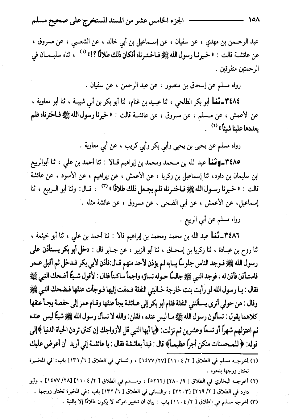 3485 - وَثنا عَبْدُ اللَّهِ بْنُ مُحَمَّدٍ وَمُحَمَّدُ بْنُ إِبْرَاهِيمَ قَالا ثَنَا أَحْمَدُ بْنُ عَليّ ثَنَا أَبُو الرّبيع ابْن سُلَيْمَانَ بْنِ دَاوُدَ ثَنَا إِسْمَاعِيلُ بْنُ زَكَرِيَّا عَنِ الأَعْمَشِ عَنْ إِبْرَاهِيمَ عَنِ الأَسْوَدِ عَنْ عَائِشَةَ قَالَتْ (خَيَّرَنَا رَسُولُ اللَّهِ صَلَّى اللَّهُ عَلَيْهِ وَسَلَّمَ فَاخْتَرْنَاهُ فَلَمْ يَجْعَلْ ذَلِكَ طَلاقًا) قَالَ وَثنا أَبُو الرَّبِيعِ ثَنَا إِسْمَاعِيلُ عَنِ الأَعْمَشِ عَنْ أَبِي الضُّحَى عَنْ مَسْرُوقٍ عَنْ عَائِشَةَ مِثْلَهُ