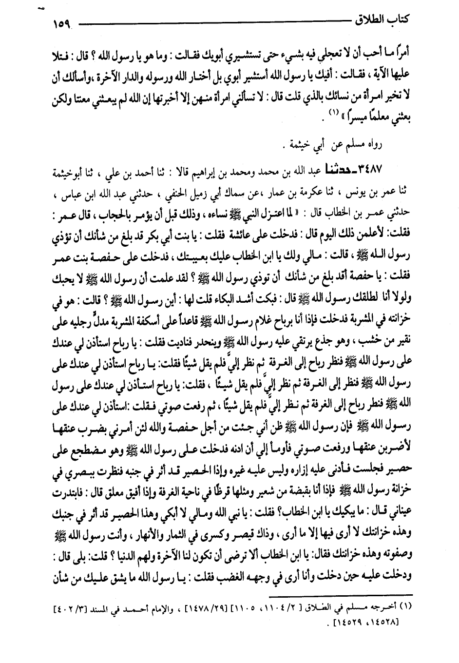 3487 - حَدَّثَنَا عَبْدُ اللَّهِ بْنُ مُحَمَّدٍ وَمُحَمَّدُ بْنُ إِبْرَاهِيمَ قَالا ثَنَا أَحْمَدُ بْنُ عَلِيٍّ ثَنَا أَبُو خَيْثَمَةَ ثَنَا عُمَرُ بْنُ يُونُسَ ثَنَا عِكْرِمَةُ بْنُ عَمَّارٍ عَنْ سِمَاكٍ أَبِي زُمَيْلٍ الْحَنَفِيِّ حَدَّثَنِي عَبْدُ الله ابْن عَبَّاسٍ حَدَّثَنِي عُمَرُ بْنُ الْخَطَّابِ قَالَ (لَمَّا اعْتَزَلَ النَّبِيُّ صَلَّى اللَّهُ عَلَيْهِ وَسَلَّمَ نِسَاءَهُ وَذَلِكَ قَبْلَ أَنْ يُؤْمَرَ بِالْحِجَابِ قَالَ عُمَرُ فَقُلْتُ لَأَعْلَمَنَّ ذَلِكَ الْيَوْمَ قَالَ فَدَخَلْتُ عَلَى عَائِشَةَ فَقُلْتُ يَا بِنْتَ أَبِي بَكْرٍ قَدْ بَلَغَ مِنْ شَأْنِكِ أَنْ تُؤْذِي رَسُولُ اللَّهِ صَلَّى اللَّهُ عَلَيْهِ وَسَلَّمَ قَالَتْ مَالِي وَلَكَ يَا ابْنَ الْخَطَّابِ عَلَيْكَ بِعَيْبَتِكَ فَدَخَلْتُ عَلَى حَفْصَةَ بِنْتِ عُمَرَ فَقُلْتُ يَا حَفْصَةُ أَقَدْ بَلَغَ مِنْ شَأْنِكِ أَنْ تُؤْذِي رَسُولَ اللَّهِ صَلَّى اللَّهُ عَلَيْهِ وَسَلَّمَ لَقَدْ عَلِمْتَ أَنَّ رَسُولَ اللَّهِ صَلَّى اللَّهُ عَلَيْهِ وَسَلَّمَ لَا يُحِبُّكِ وَلَوْلا أَنَا لَطَلَّقَكِ رَسُولُ اللَّهِ صَلَّى اللَّهُ عَلَيْهِ وَسَلَّمَ قَالَ فَبَكَتْ أَشَدَّ الْبُكَاءِ قُلْتُ لَهَا أَيْنَ رَسُولُ اللَّهِ صَلَّى اللَّهُ عَلَيْهِ وَسَلَّمَ قَالَتْ هُوَ فِي خِزَانَتِهِ فِي الْمَشْرُبَةِ فَدَخَلْتُ فَإِذَا أَنَا بِرَبَاحٍ غُلامِ رَسُولِ اللَّهِ صَلَّى اللَّهُ عَلَيْهِ وَسَلَّمَ قَاعِدًا عَلَى أُسْكُفَّةِ الْمَشْرُبَةِ مُدَلٍّ رِجْلَيْهِ عَلَى نَقِيرٍ مِنْ خَشَبٍ وَهُوَ جِذْعٌ يَرْتَقِي عَلَيْهِ رَسُولُ اللَّهِ صَلَّى اللَّهُ عَلَيْهِ وَسَلَّمَ وَيَنْحَدِرُ فَنَادَيْتُ فَقُلْتُ يَا رَبَاحُ اسْتَأْذِنْ لِي عِنْدَكَ عَلَى رَسُولِ اللَّهِ صَلَّى اللَّهُ عَلَيْهِ وَسَلَّمَ فَنَظَرَ رَبَاحٌ إِلَى الْغُرْفَةِ ثُمَّ نَظَرَ إِلَيَّ فَلَمْ يَقُلْ شَيْئًا فَقُلْتُ يَا رَبَاحُ اسْتَأْذِنْ لِي عِنْدَكَ عَلَى رَسُولِ اللَّهِ صَلَّى اللَّهُ عَلَيْهِ وَسَلَّمَ فَنَظَرَ إِلَى الْغُرْفَةِ ثُمَّ نَظَرَ إِلَيَّ فَلَمْ يَقُلْ شَيْئًا فَقُلْتُ يَا رَبَاحُ اسْتَأْذِنْ لِي عِنْدَكَ عَلَى رَسُولِ اللَّهِ صَلَّى اللَّهُ عَلَيْهِ وَسَلَّمَ فَنَظَرَ رَبَاحٌ إِلَى الْغُرْفَةِ ثُمَّ نَظَرَ إِلَيَّ فَلَمْ يَقُلْ شَيْئًا ثُمَّ رَفَعْتُ صَوْتِي فَقُلْتُ اسْتَأْذِنْ لِي عِنْدَكَ عَلَى رَسُولِ اللَّهِ صَلَّى اللَّهُ عَلَيْهِ وَسَلَّمَ فَإِنَّ رَسُولَ اللَّهِ صَلَّى اللَّهُ عَلَيْهِ وَسَلَّمَ ظَنَّ أَنِّي جِئْتُ مِنْ أَجْلِ حَفْصَةَ وَاللَّهِ لَئِنْ أَمَرَنِي بِضَرْبِ عُنُقِهَا لَأَضْرِبَنَّ عُنُقَهَا وَرَفَعْتُ صَوْتِي فَأَوْمَأَ إِلَيَّ أَنِ ادْنُهْ فَدَخَلْتُ عَلَى رَسُولِ اللَّهِ صَلَّى اللَّهُ عَلَيْهِ وَسَلَّمَ وَهُوَ مُضْطَجِعٌ عَلَى حَصِيرٍ فَجَلَسْتُ فَأَدْنَى عَلَيْهِ إِزَارَهُ وَلَيْسَ عَلَيْهِ غَيْرُهُ وَإِذَا الْحَصِيرُ قَدْ أَثَّرَ فِي جَنْبِهِ فَنَظَرْتُ بِبَصَرِي فِي خِزَانَةِ رَسُولِ اللَّهِ صَلَّى اللَّهُ عَلَيْهِ وَسَلَّمَ فَإِذَا أَنَا بِقَبْضَةٍ مِنْ شَعِيرٍ وَمِثْلِهَا قَرَظًا فِي نَاحِيَةِ الْغُرْفَةِ وَإِذَا أفِيق مُعَلّق قَالَ فابتدرت عيناني قَالَ مَا يبكيك يَا ابْن الْخَطَّابِ فَقُلْتُ يَا نَبِيَّ اللَّهِ وَمَالِي لَا أَبْكِي وَهَذَا الْحَصِيرُ قَدْ أَثَّرَ فِي جَنْبِكَ وَهَذِهِ خِزَانَتُكَ لَا أَرَى فِيهَا إِلَّا مَا أَرَى وَذَاكَ قَيْصَرُ وَكِسْرَى فِي الثِّمَارِ وَالأَنْهَارِ وَأَنْتَ رَسُولُ اللَّهِ صَلَّى اللَّهُ عَلَيْهِ وَسَلَّمَ وَصَفْوَتُهُ وَهَذِهِ خِزَانَتُكَ فَقَالَ يَا ابْنَ الْخَطَّابِ أَلا تَرْضَى أَنْ تَكُونَ لَنَا الْآخِرَةُ وَلَهُمُ الدُّنْيَا قُلْتُ بَلَى قَالَ وَدَخَلْتُ ع