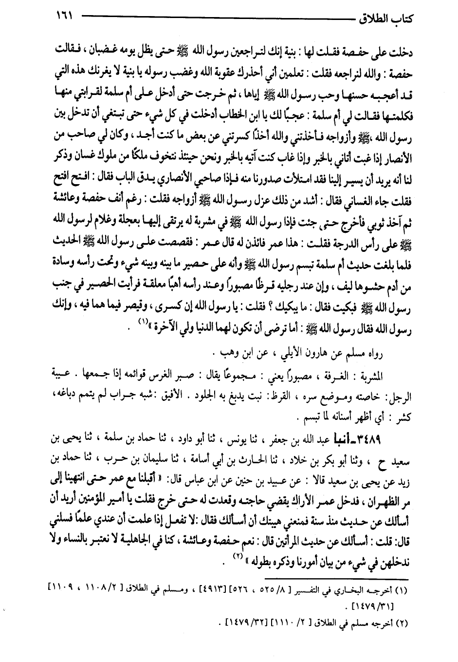 دَخَلْتُ عَلَى حَفْصَةَ فَقُلْتُ لَهَا بُنَيَّةُ إِنَّكِ لَتُرَاجِعِينَ رَسُولَ اللَّهِ صَلَّى اللَّهُ عَلَيْهِ وَسَلَّمَ حَتَّى يَظَلَّ يَوْمَهُ غَضْبَانَ فَقَالَتْ حَفْصَةُ وَاللَّهِ لَنُرَاجِعُهُ فَقُلْتُ تَعْلَمِينَ أَنِّي أُحَذِّرُكِ عُقُوبَةَ اللَّهِ وَغَضَبَ رَسُولِهِ يَا بُنَيَّةُ لَا يَغُرَّنَّكِ هَذِهِ الَّتِي قَدْ أَعْجَبَهُ حُسْنُهَا وَحُبُّ رَسُولُ اللَّهِ صَلَّى اللَّهُ عَلَيْهِ وَسَلَّمَ إِيَّاهَا ثُمَّ خَرَجْتُ حَتَّى أَدْخُلَ عَلَى أُمِّ سَلَمَةَ لِقَرَابَتِي مِنْهَا فَكَلَّمْتُهَا فَقَالَتْ لِي أُمُّ سَلَمَةَ عَجَبًا لَكَ يَا ابْنَ الْخَطَّابِ أَدَخَلْتَ فِي كُلِّ شَيْءٍ حَتَّى تَبْتَغِيَ أَنْ تَدْخُلَ بَيْنَ رَسُولُ اللَّهِ صَلَّى اللَّهُ عَلَيْهِ وَسَلَّمَ وَأَزْوَاجِهِ فَأَخَذَتْنِي وَاللَّهِ أَخْذًا كَسَرَتْنِي عَنْ بَعْضِ مَا كُنْتُ أَجِدُ وَكَانَ لِي صَاحِبٌ مِنَ الأَنْصَارِ إِذَا غِبْتُ أَتَانِي بِالْخَبَرِ وَإِذَا غَابَ كُنْتُ آتِيهِ بِالْخَبَرِ وَنَحْنُ حِينَئِذٍ نَتَخَوَّفُ مَلِكًا مِنْ مُلُوكِ غَسَّانَ وَذُكِرَ لَنَا أَنَّهُ يُرِيدُ أَنْ يَسِيرَ إِلَيْنَا فَقَدِ امْتَلَأَتْ صُدُورُنَا مِنْهُ فَإِذَا صَاحِبِي الأَنْصَارِيُّ يَدُقُّ الْبَابَ فَقَالَ افْتَحِ افْتَحْ فَقُلْتُ جَاءَ الْغَسَّانِيُّ فَقَالَ أَشَدُّ مِنْ ذَلِكَ عَزَلَ رَسُولُ اللَّهِ صَلَّى اللَّهُ عَلَيْهِ وَسَلَّمَ أَزْوَاجَهُ فَقُلْتُ رَغْمَ أَنْفِ حَفْصَةَ وَعَائِشَةَ ثُمَّ آخُذُ ثَوْبِي فَأَخْرُجُ حَتَّى جِئْتُ فَإِذَا رَسُولُ اللَّهِ صَلَّى اللَّهُ عَلَيْهِ وَسَلَّمَ فِي مَشْرُبَةٍ لَهُ يُرْتَقَى إِلَيْهَا بِعَجَلَةٍ وَغُلامٌ لِرَسُولِ اللَّهِ صَلَّى اللَّهُ عَلَيْهِ وَسَلَّمَ عَلَى رَأْسِ الدَّرَجَةِ فَقُلْتُ هَذَا عُمَرُ فَائْذَنْ لَهُ قَالَ عُمَرُ فَقَصَصْتُ عَلَى رَسُولِ اللَّهِ صَلَّى اللَّهُ عَلَيْهِ وَسَلَّمَ الْحَدِيثَ فَلَمَّا بَلَغْتُ حَدِيثَ أُمِّ سَلَمَةَ تَبَسَّمَ رَسُولُ اللَّهِ صَلَّى اللَّهُ عَلَيْهِ وَسَلَّمَ وَأَنَّهُ عَلَى حَصِيرٍ مَا بَيْنَهُ وَبَيْنَهُ شَيْءٌ وَتَحْتَ رَأْسِهِ وِسَادَةٌ مِنْ أَدَمٍ حَشْوُهَا لِيفٌ وَإِنَّ عِنْدَ رِجْلَيْهِ قَرَظًا مَصْبُورًا وَعِنْدَ رَأْسِهِ أُهُبًا مُعَلَّقَةً فَرَأَيْتُ الْحَصِيرَ فِي جَنْبِ رَسُولُ اللَّهِ صَلَّى اللَّهُ عَلَيْهِ وَسَلَّمَ فَبَكَيْتُ فَقَالَ مَا يُبْكِيكَ فَقُلْتُ يَا رَسُولَ اللَّهِ إِنَّ كِسْرَى وَقَيْصَرَ فِيمَا هُمَا فِيهِ وَإِنَّكَ رَسُولُ اللَّهِ فَقَالَ رَسُولُ اللَّهِ صَلَّى اللَّهُ عَلَيْهِ وَسَلَّمَ أَمَا تَرْضَى أَنْ تَكُونَ لَهُمَا الدُّنْيَا وَلِي الْآخِرَةُ)
