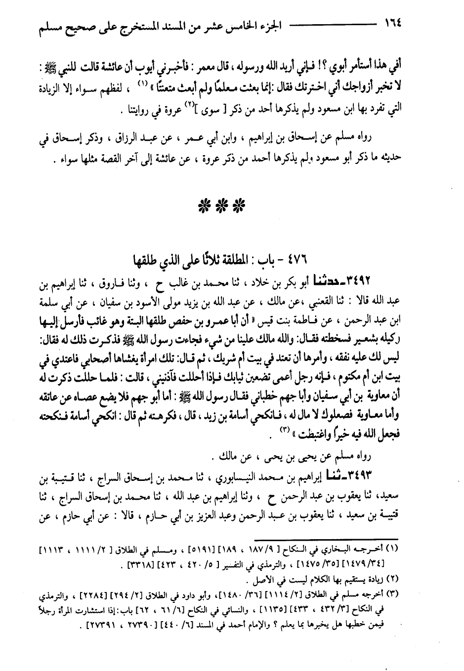 3492 - حَدَّثَنَا أَبُو بَكْرِ بْنُ خَلادٍ ثَنَا مُحَمَّدُ بْنُ غَالِبٍ ح وَثنا فَارُوقٌ ثَنَا إِبْرَاهِيمُ بْنُ عَبْدِ اللَّهِ قَالا ثَنَا الْقَعْنَبِيُّ عَنْ مَالِكٍ عَنْ عَبْدِ اللَّهِ بْنِ يَزِيدَ مَوْلَى الأَسْوَدِ بْنِ سُفْيَانَ عَن أبي سَلمَة ابْن عَبْدِ الرَّحْمَنِ عَنْ فَاطِمَةَ بِنْتِ قَيْسٍ (أَنَّ أَبَا عَمْرِو بْنَ حَفْصٍ طَلَّقَهَا الْبَتَّةَ وَهُوَ غَائِبٌ فَأَرْسَلَ إِلَيْهَا وَكِيلُهُ بِشَعِيرٍ فَسَخِطَتْهُ فَقَالَ وَالله مَالك عَلَيْنَا مِنْ شَيْءٍ فَجَاءَتْ رَسُولُ اللَّهِ صَلَّى اللَّهُ عَلَيْهِ وَسَلَّمَ فَذَكَرَتْ ذَلِكَ لَهُ فَقَالَ لَيْسَ لَكِ عَلَيْهِ نَفَقَةٌ وَأَمَرَهَا أَنْ تَعْتَدَّ فِي بَيْتِ أُمِّ شَرِيكٍ ثُمَّ قَالَ تِلْكَ امْرَأَةٌ يَغْشَاهَا أَصْحَابِي فَاعْتَدِّي فِي بَيْتِ ابْنِ أُمِّ مَكْتُومٍ فَإِنَّهُ رَجُلٌ أَعْمَى تَضَعِينَ ثِيَابَكِ فَإِذَا أَحْلَلْتِ فَآذِنِينِي قَالَتْ فَلَمَّا حَلَلْتُ ذَكَرْتُ لَهُ أَنَّ مُعَاوِيَةَ بْنَ أَبِي سُفْيَانَ وَأَبَا جَهْمٍ خَطَبَانِي فَقَالَ رَسُولُ اللَّهِ صَلَّى اللَّهُ عَلَيْهِ وَسَلَّمَ أَمَّا أَبُو جَهْمٍ فَلا يَضَعُ عَصَاهُ عَنْ عَاتِقِهِ وَأَمَّا مُعَاوِيَةُ فَصُعْلُوكٌ لَا مَالَ لَهُ فَانْكِحِي أُسَامَةَ بْنَ زَيْدٍ قَالَ فَكَرِهْتُهُ ثُمَّ قَالَ انْكِحِي أُسَامَةَ فَنَكَحْتُهُ فَجَعَلَ اللَّهُ فِيهِ خَيْرًا وَاغْتَبَطْتُ)