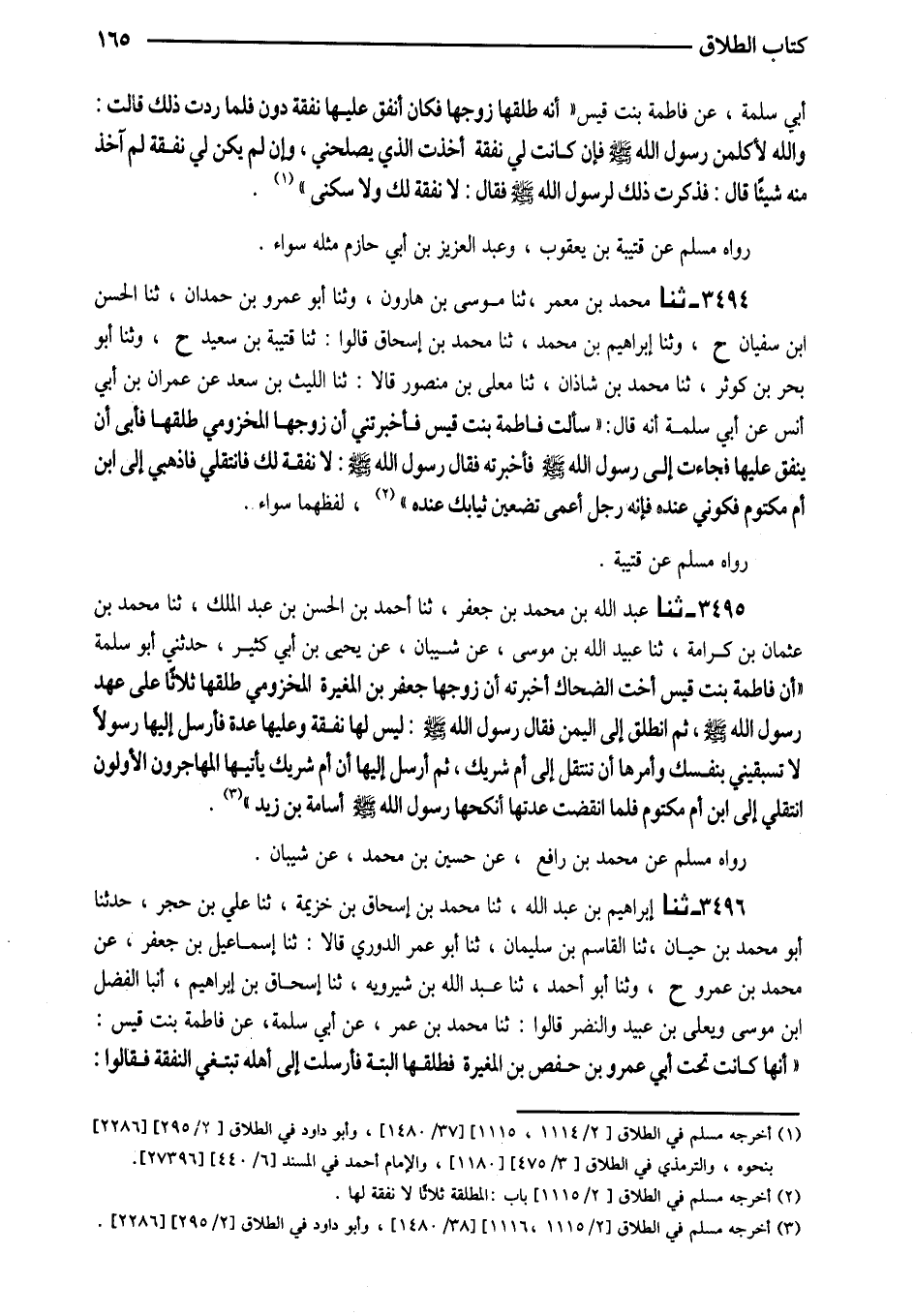 3494 - ثَنَا مُحَمَّدُ بْنُ مَعْمَرٍ ثَنَا مُوسَى بْنُ هَارُونَ وَثنا أَبُو عَمْرِو بْنُ حَمْدَانَ ثَنَا الْحَسَنُ ابْن سُفْيَانَ ح وَثَنَا إِبْرَاهِيمُ بْنُ مُحَمَّدٍ ثَنَا مُحَمَّدُ بْنُ إِسْحَاقَ قَالُوا ثَنَا قُتَيْبَةُ بْنُ سَعِيدٍ ح وَثنا أَبُو بَحْرِ بْنُ كَوْثَرٍ ثَنَا مُحَمَّدُ بْنُ شَاذَانَ ثَنَا مُعَلَّى بْنُ مَنْصُورٍ قَالا ثَنَا اللَّيْثُ بْنُ سَعْدٍ عَنِ عِمْرَانَ بْنِ أَبِي أَنَسٍ عَنْ أَبِي سَلَمَةَ أَنَّهُ قَالَ (سَأَلْتُ فَاطِمَةَ بِنْتَ قَيْسٍ فَأَخْبَرَتْنِي أَنَّ زَوْجَهَا الْمَخْزُومِيَّ طَلَّقَهَا فَأَبَى أَنْ يُنْفِقَ عَلَيْهَا فَجَاءَتْ إِلَى رَسُولِ اللَّهِ صَلَّى اللَّهُ عَلَيْهِ وَسَلَّمَ فَأَخْبَرَتْهُ فَقَالَ رَسُولُ اللَّهِ صَلَّى اللَّهُ عَلَيْهِ وَسَلَّمَ لَا نَفَقَةَ لَكِ فَانْتَقِلِي فَاذْهَبِي إِلَى ابْنِ أُمِّ مَكْتُومٍ فَكُونِي عِنْدَهُ فَإِنَّهُ رَجُلٌ أَعْمَى تَضَعِينَ ثِيَابَكِ عِنْدَهُ) لَفْظُهُمَا سَوَاءٌ