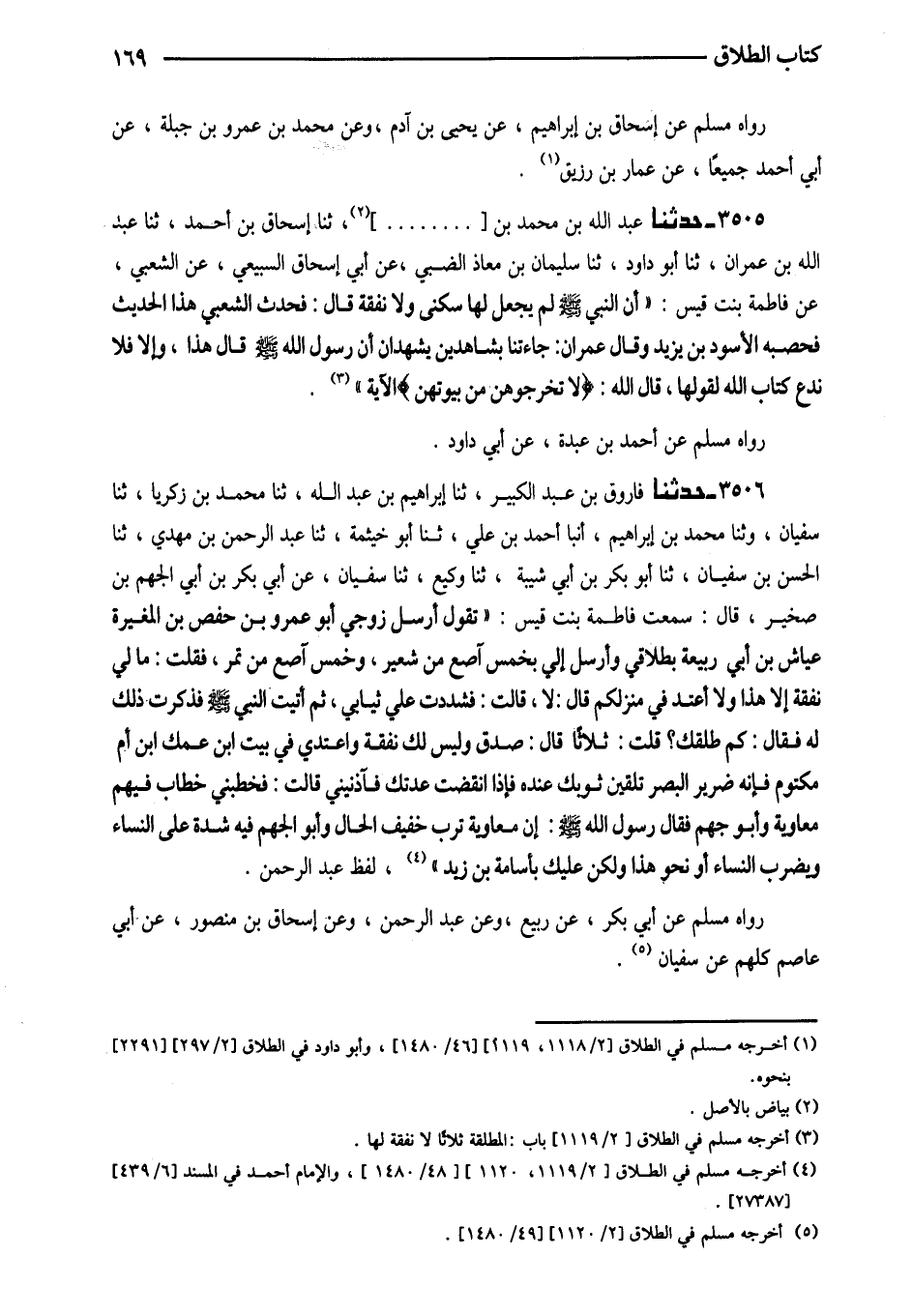 3505 - حَدَّثَنَا عَبْدُ اللَّهِ بْنُ مُحَمَّدِ بْنِ ... ... ثَنَا إِسْحَاقُ بْنُ أَحْمَدَ ثَنَا عَبْدُ اللَّهِ بْنُ عِمْرَانَ ثَنَا أَبُو دَاوُدَ ثَنَا سُلَيْمَانُ بْنُ مُعَاذٍ الضَّبِيُّ عَنْ أَبِي إِسْحَاقَ السَّبِيعِيِّ عَنِ الشَّعْبِيِّ عَنْ فَاطِمَةَ بِنْتِ قَيْسٍ (أَنَّ النَّبِيَّ صَلَّى اللَّهُ عَلَيْهِ وَسَلَّمَ لَمْ يَجْعَلْ لَهَا سُكْنَى وَلا نَفَقَةً قَالَ فَحَدَّثَ الشَّعْبِيُّ هَذَا الْحَدِيثَ فَحَصَبَهُ الأَسْوَدُ بْنُ يَزِيدَ وَقَالَ عِمْرَانُ جائتنا بِشَاهِدَيْنِ يَشْهَدَانِ أَنَّ رَسُولَ اللَّهِ صَلَّى اللَّهُ عَلَيْهِ وَسَلَّمَ قَالَ هَذَا وَإِلَّا فَلا نَدَعُ كِتَابَ اللَّهِ لِقَوْلِهَا قَالَ اللَّهُ {لَا تخرجوهن من بُيُوتهنَّ} الْآيَةَ)