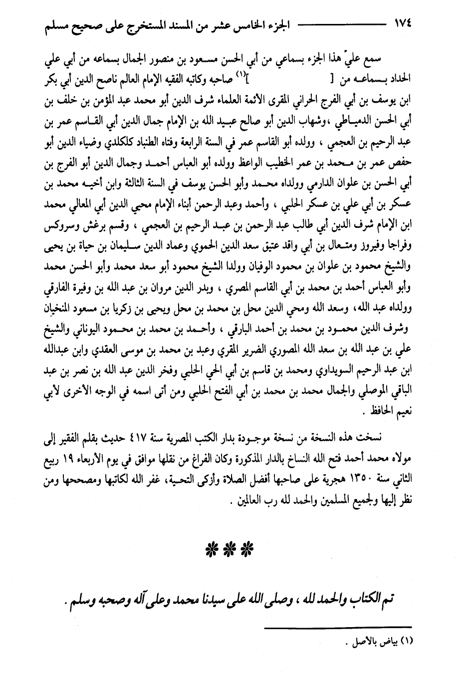 نسخت هَذِه النُّسْخَة من نُسْخَة مَوْجُودَة بدار الْكتب المصرية سنة 417 حَدِيث بقلم الْفَقِير إِلَى مَوْلَاهُ مُحَمَّد أَحْمد فتح الله النساخ بِالدَّار الْمَذْكُورَة وَكَانَ الْفَرَاغ من نقلهَا مُوَافق فِي يَوْم الْأَرْبَعَاء 19 ربيع الثَّانِي سنة 1350 هجرية على صَاحبهَا أفضل الصَّلَاة وأزكى التَّحِيَّة غفر الله لكاتبها ومصححها وَمن نظر إِلَيْهَا وَلِجَمِيعِ الْمُسلمين وَالْحَمْد لله رب الْعَالمين
