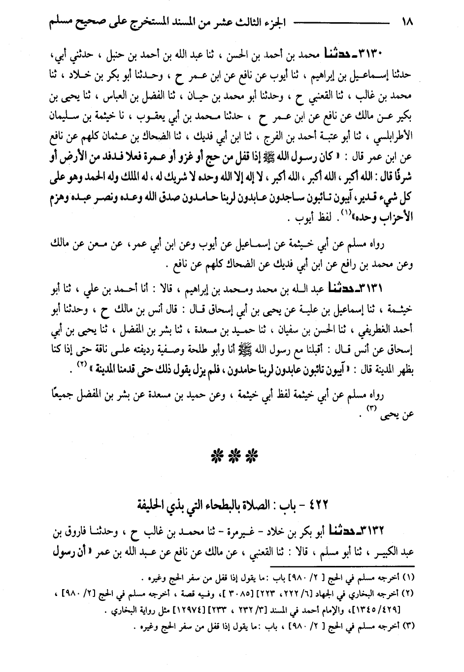 3130 - حَدَّثَنَا مُحَمَّدُ بْنُ أَحْمَدَ بْنِ الْحَسَنِ ثَنَا عَبْدُ اللَّهِ بْنُ أَحْمَدَ بْنِ حَنْبَلٍ حَدَّثَنِي أَبِي حَدَّثَنَا إِسْمَاعِيلُ بْنُ إِبْرَاهِيمَ ثَنَا أَيُّوبَ عَنْ نَافِعٍ عَنِ ابْنِ عُمَرَ ح وَحَدَّثَنَا أَبُو بَكْرٍ بْنُ خَلادٍ ثَنَا مُحَمَّدُ بْنُ غَالِبٍ ثَنَا الْقَعْنَبِيُّ ح وَحَدَّثَنَا أَبُو مُحَمَّدِ بْنُ حَيَّانَ ثَنَا الْفَضْلُ بْنُ الْعَبَّاسِ ثَنَا يَحْيَى بْنُ بَكِيرٍ عَنْ مَالِكٍ عَنْ نَافِعٌ عَنِ ابْنِ عُمَرَ ح حَدَّثَنَا مُحَمَّدُ بْنُ أَبِي يَعْقُوبَ نَا خَيْثَمَةُ بْنُ سُلَيْمَانَ الأَطْرَابُلْسِيُّ ثَنَا أَبُو عُتْبَةَ أَحْمَدُ بْنُ الْفَرَجِ ثَنَا ابْنُ أَبِي فُدَيْكٍ ثَنَا الضَّحَّاكُ بْنُ عُثْمَانَ كُلُّهُمْ عَنْ نَافِعٍ عَنِ ابْنِ عُمَرَ قَالَ (كَانَ رَسُولُ اللَّهِ صَلَّى اللَّهُ عَلَيْهِ وَسَلَّمَ إِذَا قَفَلَ مِنْ حَجٍّ أَوْ غَزْوٍ أَوْ عُمْرَةٍ فَعَلا فَدْفَدٍ مِنَ الأَرْضِ أَوْ شَرَفًا قَالَ اللَّهُ أَكْبَرُ اللَّهُ أَكْبَرُ اللَّهُ أَكْبَرُ لَا إِلَهَ إِلا اللَّهُ وَحْدَهُ لَا شَرِيكَ لَهُ لَهُ الْمُلْكُ وَلَهُ الْحَمْدُ وَهُوَ عَلَى كُلِّ شَيْءٍ قَدِيرٌ آيِبُونَ تَائِبُونَ سَاجِدُونَ عَابِدُونَ لِرَبِّنَا حَامِدُونَ صَدَقَ اللَّهُ وَعْدَهُ وَنَصَرَ عَبْدَهُ وَهَزَمَ الأَحْزَابَ وَحْدَهُ) لَفْظُ أَيُّوبَ