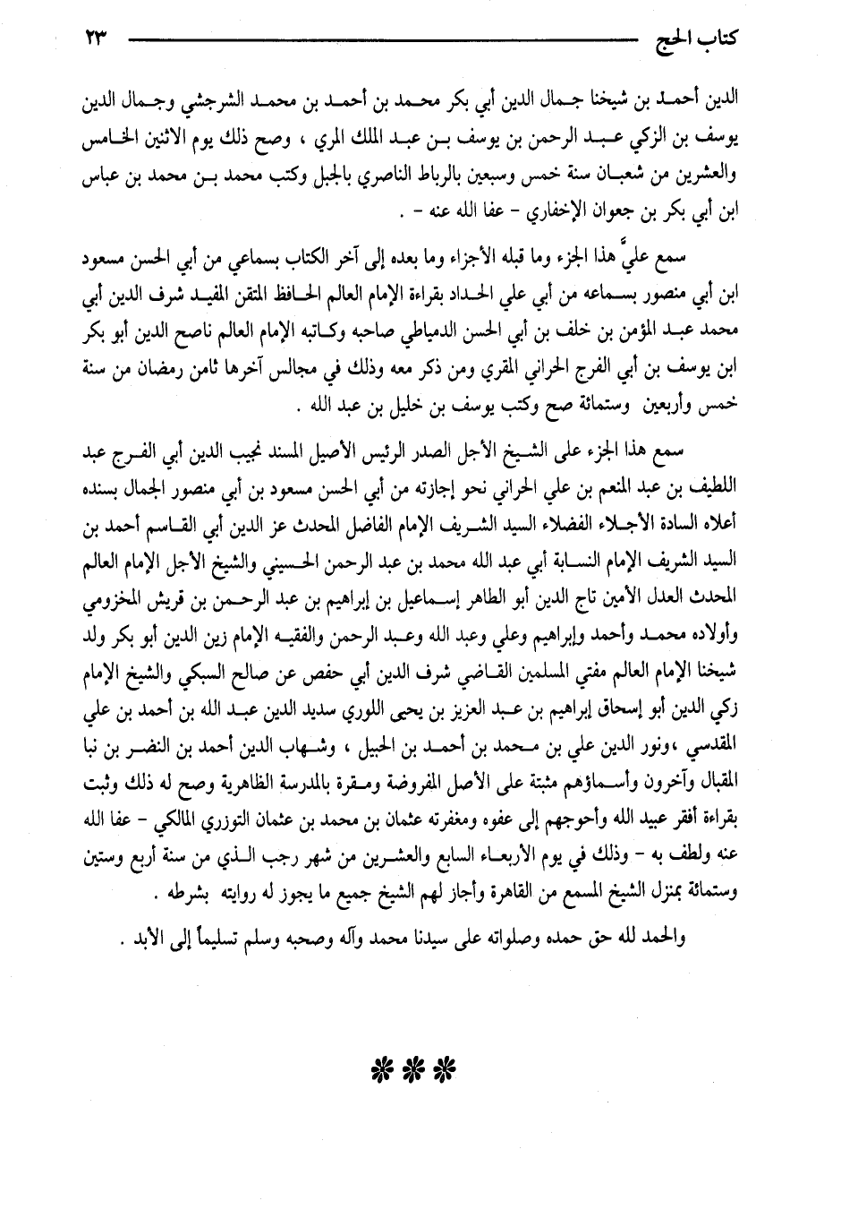 الدَّين أَحْمد بن شَيخنَا جمال الدَّين أبي بَكْرٍ مُحَمَّدُ بْنُ أَحْمَدَ بْنِ مُحَمَّد الشرجشي وجمال الدَّين يُوسُف بن الزكي عبد الرَّحْمَن بن يُوسُف بن عبد الْملك المري وَصَحَّ ذَلِك يَوْم الْإِثْنَيْنِ الْخَامِس وَالْعِشْرين من شعْبَان سنة خمس وَسبعين بالرباط الناصري بِالْجَبَلِ وَكتب مُحَمَّد بن مُحَمَّد بن عَبَّاس ابْن أبي بكر بن جعوان الإخفاري عَفا الله عَنهُ