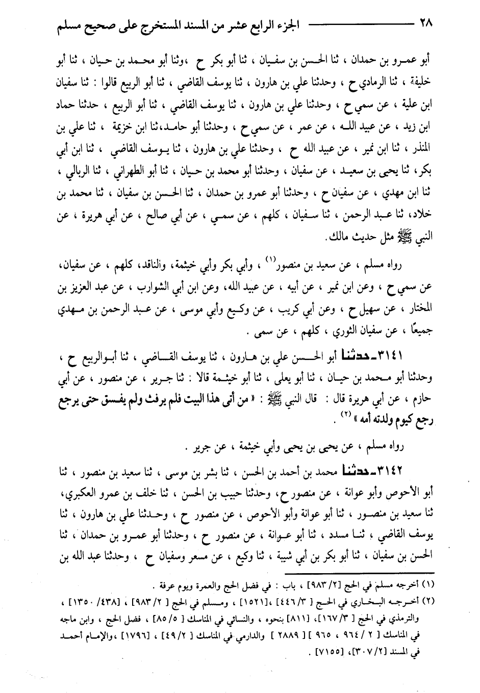 3141 - حَدَّثَنَا أَبُو الْحَسَنِ عَلِيُّ بْنُ هَارُونَ ثَنَا يُوسُفُ الْقَاضِي ثَنَا أَبُو الرَّبِيعِ ح وَحَدَّثَنَا أَبُو مُحَمَّدِ بْنُ حَيَّانَ ثَنَا أَبُو يَعْلَى ثَنَا أَبُو خَيْثَمَةَ قَالا ثَنَا جَرِيرٌ عَنْ مَنْصُورٍ عَنْ أَبِي حَازِمٍ عَنْ أَبِي هُرَيْرَةَ قَالَ قَالَ النَّبِيُّ صَلَّى اللَّهُ عَلَيْهِ وَسَلَّمَ (مَنْ أَتَى هَذَا الْبَيْتَ فَلَمْ يَرْفُثْ وَلَمْ يَفْسُقْ حَتَّى يَرْجِعَ رَجَعَ كَيَوْمِ وَلَدَتْهُ أُمُّهُ)