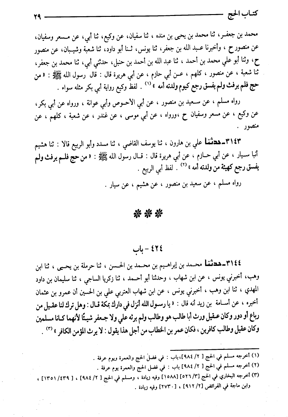 مُحَمَّدِ بْنِ جَعْفَرٍ ثَنَا مُحَمَّدُ بْنُ يَحْيَى بْنِ مَنْدَهْ ثَنَا سُفْيَان عَن وَكِيعٍ ثَنَا أَبِي عَنْ مِسْعَرٍ وسُفْيَان عَن مَنْصُور ح وأَخْبَرَنَا عَبْدُ اللَّهِ بْنُ جَعْفَرٍ ثَنَا يُونُسُ ثَنَا أَبُو دَاوُدَ ثَنَا شُعْبَةُ وَشَيْبَانُ عَنْ مَنْصُورٍ ح وَثنا أَبُو عَلِيٍّ مُحَمَّدُ بْنُ أَحْمَدَ ثَنَا عَبْدُ اللَّهِ بْنُ أَحْمَدَ بْنِ حَنْبَلٍ حَدَّثَنِي أَبِي ثَنَا مُحَمَّدُ بْنُ جَعْفَرٍ ثَنَا شُعْبَةُ عَنْ مَنْصُورٍ كُلُّهُمْ عَنْ أَبِي حَازِمٍ عَنْ أَبِي هُرَيْرَةَ قَالَ قَالَ رَسُولُ اللَّهِ صَلَّى اللَّهُ عَلَيْهِ وَسَلَّمَ (مِنْ حَجَّ فَلَمْ يَرْفُثْ وَلَمْ يَفْسُقْ رَجَعَ كَيَوْمِ وَلَدَتْهُ أُمُّهُ) لَفْظُ وَكِيعٍ رِوَايَةُ أَبِي بَكْرٍ مِثْلُهُ سَوَاءٌ