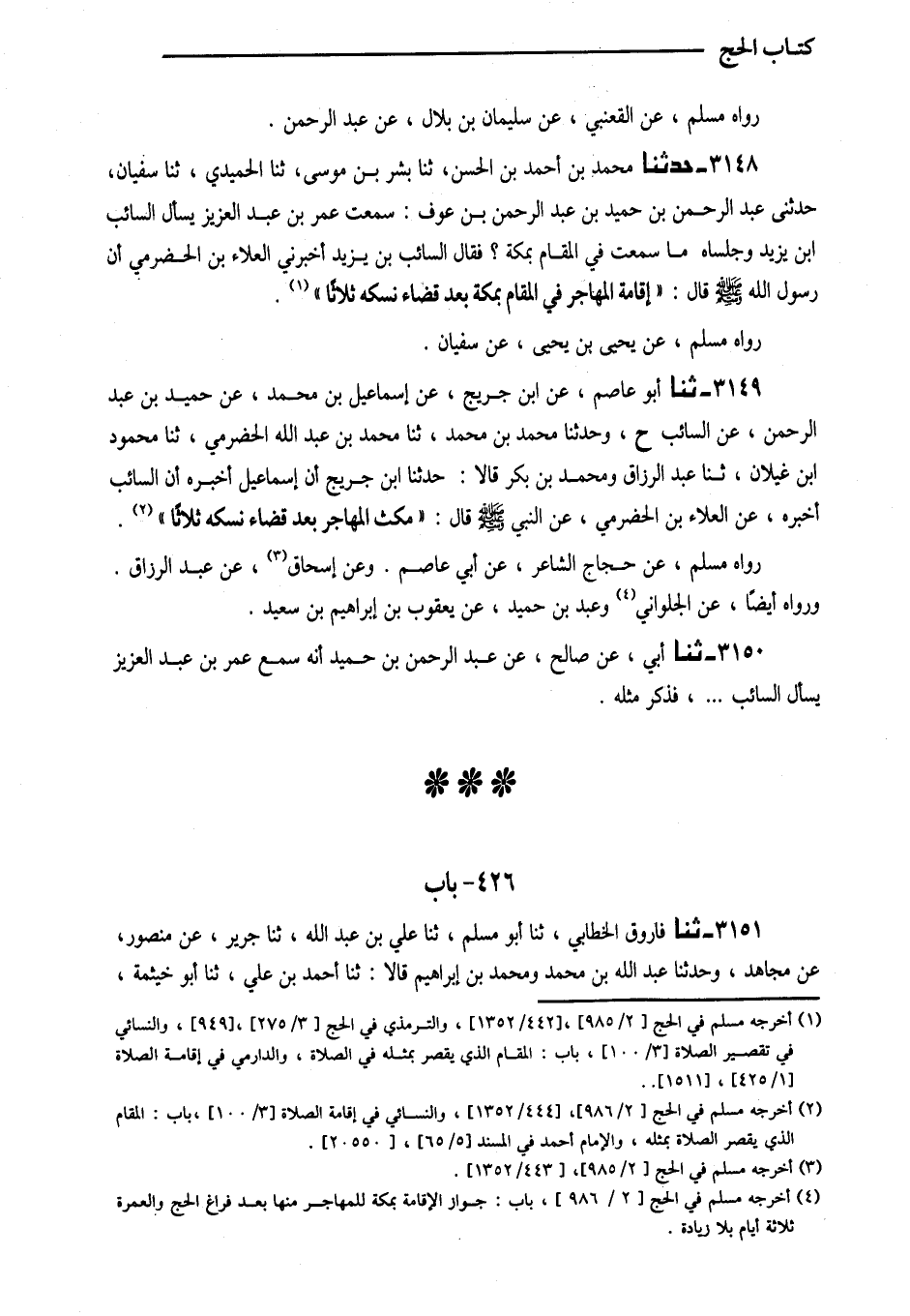 3148 - حَدَّثَنَا مُحَمَّدُ بْنُ أَحْمَدَ بْنِ الْحَسَنِ ثَنَا بِشْرُ بْنُ مُوسَى ثَنَا الْحُمَيْدِيُّ ثَنَا سُفْيَانُ حَدَّثَنِي عَبْدُ الرَّحْمَنِ بْنُ حُمَيْدِ بْنِ عَبْدِ الرَّحْمَنِ بْنِ عَوْفٍ سَمِعْتُ عُمَرَ بْنَ عَبْدِ الْعَزِيزِ يسْأَل السَّائِب ابْن يزِيد وجلساه مَا سَمِعْتَ فِي الْمُقَامِ بِمَكَّةَ فَقَالَ السَّائِبُ بْنُ يَزِيدَ أَخْبَرَنِي الْعَلاءُ بْنُ الْحَضْرَمِيِّ أَنَّ رَسُولَ اللَّهِ صَلَّى اللَّهُ عَلَيْهِ وَسَلَّمَ قَالَ (إِقَامَةُ الْمُهَاجِرِ فِي الْمُقَامِ بِمَكَّةَ بَعْدَ قَضَاءِ نُسُكِهِ ثَلاثًا)