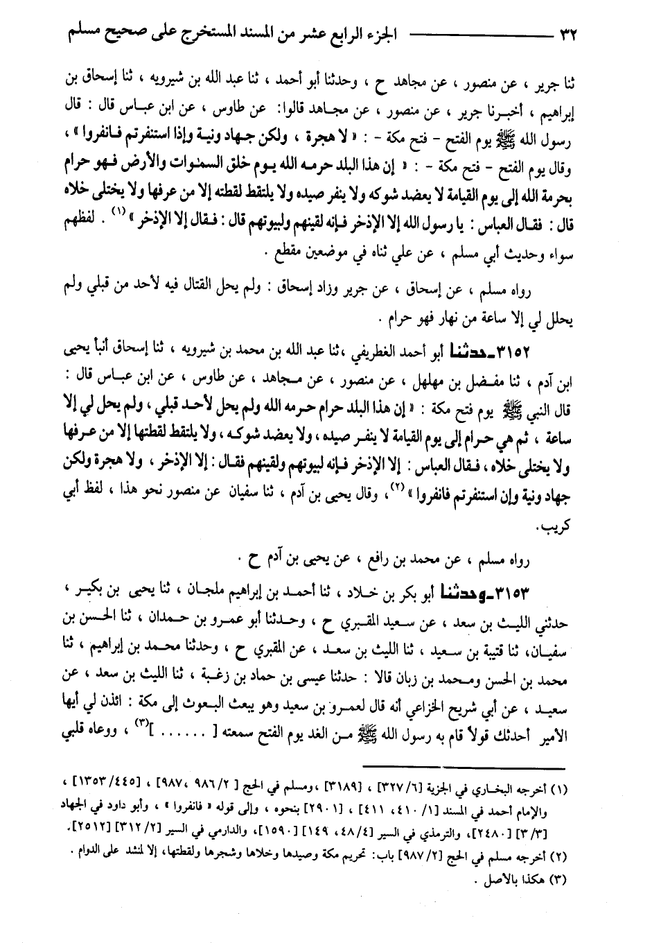3152 - حَدَّثَنَا أَبُو أَحْمَدَ الْغِطْرِيفِيُّ ثَنَا عَبْدُ اللَّهِ بْنُ مُحَمَّدِ بْنِ شِيرَوَيْهِ ثَنَا إِسْحَاق أنبأ يحيى ابْن آدَمَ ثَنَا مُفَضَّلُ بْنُ مُهَلْهَلٍ عَنْ مَنْصُورٍ عَنْ مُجَاهِدٍ عَنْ طَاوُسٍ عَنِ ابْنِ عَبَّاسٍ قَالَ قَالَ النَّبِيُّ صَلَّى اللَّهُ عَلَيْهِ وَسَلَّمَ يَوْمَ فَتْحِ مَكَّةَ (إِنَّ هَذَا الْبَلَدَ حَرَامٌ حَرَّمَهُ اللَّهُ وَلَمْ يَحِلَّ لِأَحَدٍ قَبْلِي وَلَمْ يَحِلَّ لِي إِلَّا سَاعَةً ثُمَّ هِيَ حَرَامٌ إِلَى يَوْمِ الْقِيَامَةِ لَا يُنَفَّرُ صَيْدُهُ وَلا يُعْضَدُ شَوْكُهُ وَلا يُلْتَقَطُ لُقَطَتُهَا إِلَّا مَنْ عَرَفَهَا وَلا يُخْتَلَى خَلاهُ فَقَالَ الْعَبَّاسُ إِلَّا الْإِذْخِرَ فَإِنَّهُ لِبُيُوتِهِمْ وَلِقَيْنِهِمْ فَقَالَ إِلَّا الْإِذْخِرَ وَلا هِجْرَةَ وَلَكِنْ جِهَادٌ وَنِيَّةٌ وَإِنِ اسْتُنْفِرْتُمْ فَانْفِرُوا) وَقَالَ يَحْيَى بْنُ آدَمَ ثَنَا سُفْيَانُ عَنْ مَنْصُورٍ نَحْوَ هَذَا لَفْظُ أَبِي كُرَيْبٍ