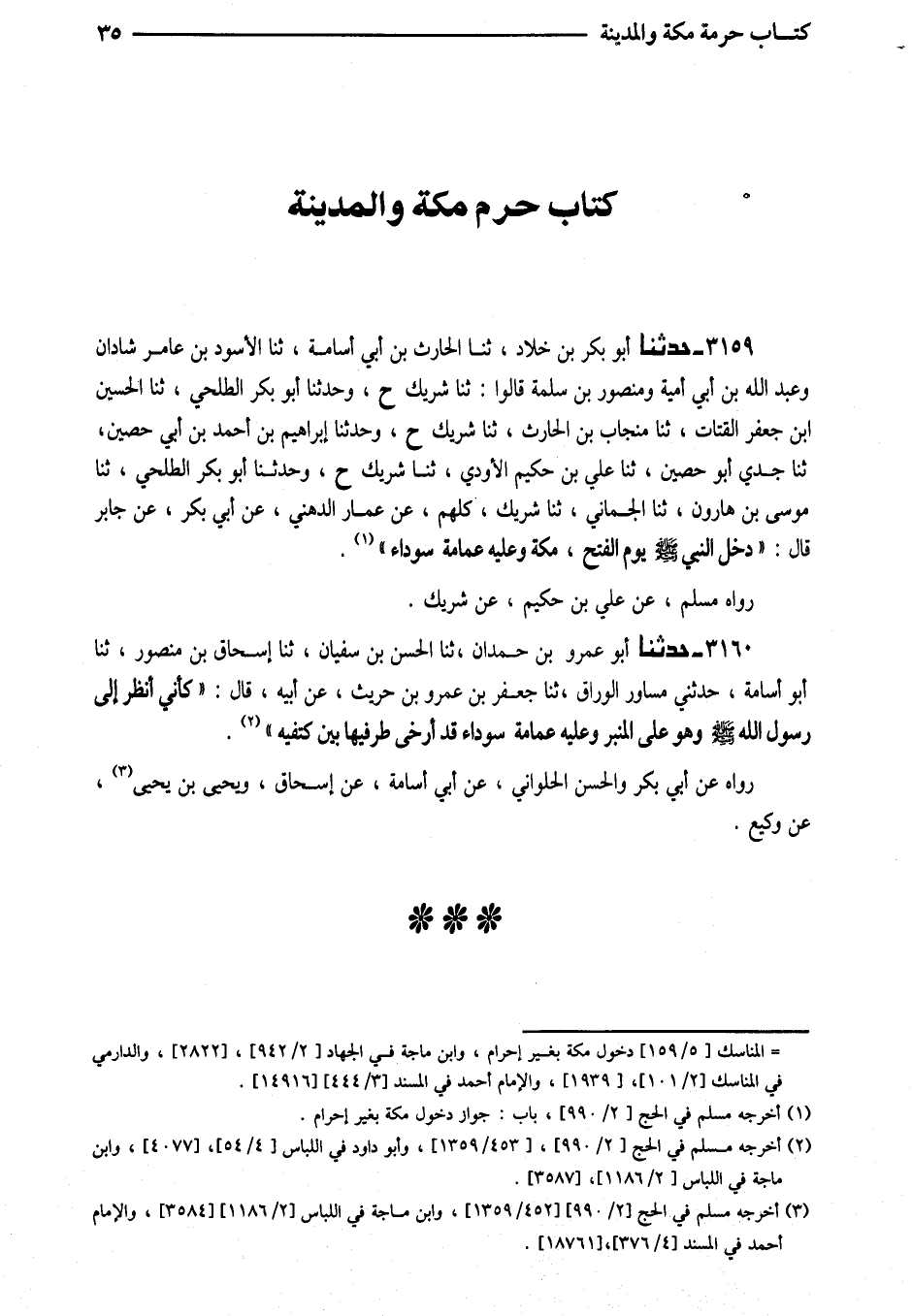 3159 - حَدَّثَنَا أَبُو بَكْرِ بْنُ خَلادٍ ثَنَا الْحَارِثُ بْنُ أَبِي أُسَامَةَ ثَنَا الْأسود بن عَامر شادان وَعَبْدَ اللَّهِ بْنَ أَبِي أُمَيَّةَ وَمَنْصُورُ بْنُ سَلَمَةَ قَالُوا ثَنَا شَرِيكٌ ح وَحَدَّثَنَا أَبُو بَكْرٍ الطلحي ثَنَا الْحُسَيْن ابْن جَعْفَرٍ الْقَتَّاتُ ثَنَا مِنْجَابُ بْنُ الْحَارِثِ ثَنَا شَرِيكٌ ح وَحَدَّثَنَا إِبْرَاهِيمُ بْنُ أَحْمَدَ بْنِ أَبِي حُصَيْنٍ ثَنَا جَدِّي أَبُو حُصَيْنٍ ثَنَا عَلِيُّ بْنُ حَكِيمٍ الأَوْدِيُّ ثَنَا شَرِيكٌ ح وَحَدَّثَنَا أَبُو بَكْرٍ الطَّلْحِيُّ ثَنَا مُوسَى بْنُ هَارُونَ ثَنَا الْجُمَّانِيُّ ثَنَا شَرِيكٌ كلهم عَن عمار الدهني عَن أبي بكر عَنْ جَابِرٍ قَالَ دَخَلَ النَّبِيُّ صَلَّى اللَّهُ عَلَيْهِ وَسَلَّمَ يَوْمَ الْفَتْحِ مَكَّةَ وَعَلَيْهِ عِمَامَةٌ سَوْدَاءُ