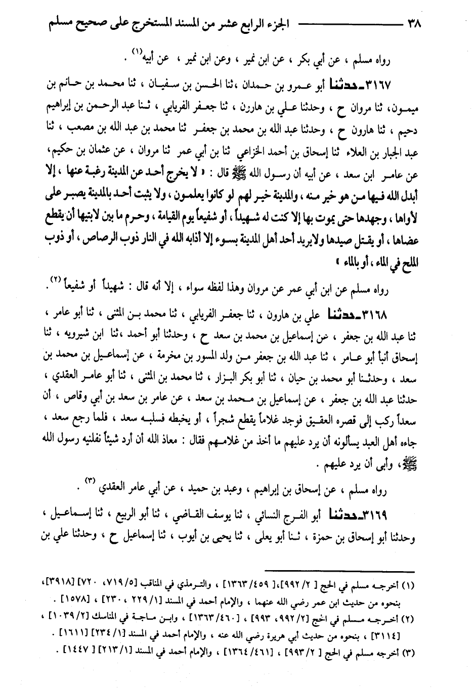 3167 - حَدَّثَنَا أَبُو عَمْرِو بْنُ حَمْدَانَ ثَنَا الْحَسَنُ بْنُ سُفْيَانَ ثَنَا مُحَمَّدُ بْنُ حَاتِمِ بْنِ مَيْمُونَ ثَنَا مَرْوَانُ ح وَحَدَّثَنَا عَلِيُّ بْنُ هَارُونَ ثَنَا جَعْفَرٌ الْفِرْيَابِيُّ ثَنَا عَبْدُ الرَّحْمَنِ بْنُ إِبْرَاهِيمَ دُحَيْمٌ ثَنَا هَارُونُ ح وَحَدَّثَنَا عَبْدُ اللَّهِ بْنُ مُحَمَّدِ بْنِ جَعْفَرٍ ثَنَا مُحَمَّدُ بْنُ عَبْدِ اللَّهِ بْنِ مُصْعَبٍ ثَنَا عَبْدُ الْجَبَّارِ بْنُ الْعَلاءِ ثَنَا إِسْحَاقُ بْنُ أَحْمَدَ الْخُزَاعِيّ ثَنَا بْنُ أَبِي عُمَرَ ثَنَا مَرْوَانُ عَنْ عُثْمَانَ بْنِ حَكِيمٍ عَنْ عَامر ابْن سَعْدٍ عَنْ أَبِيهِ أَنَّ رَسُولَ اللَّهِ صَلَّى اللَّهُ عَلَيْهِ وَسَلَّمَ قَالَ (لَا يَخْرُجُ أَحَدٌ عَنِ الْمَدِينَةِ رَغْبَةً عَنْهَا إِلَّا أَبْدَلَ اللَّهُ فِيهَا مَنْ هُوَ خَيْرٌ مِنْهُ وَالْمَدِينَةُ خَيْرٌ لَهُمْ لَوْ كَانُوا يَعْلَمُونَ وَلا يَثْبُتُ أَحَدٌ بِالْمَدِينَةِ يصبر على لأواها وَجَهْدِهَا حَتَّى يَمُوتَ بِهَا إِلَّا كُنْتُ لَهُ شَهِيدًا أَوْ شَفِيعًا يَوْمَ الْقِيَامَةِ وَحَرَّمَ مَا بَيْنَ لابتيها أَن يقطع عضاها أَوْ يُقْتَلَ صَيْدُهَا وَلا يُرِيدُ أَحَدٌ أَهْلَ الْمَدِينَةِ بِسُوءٍ إِلَّا أَذَابَهُ اللَّهُ فِي النَّارِ ذَوْبَ الرَّصَاصِ أَوْ ذَوْبَ الْمِلْحِ فِي الْمَاءِ أَوْ بِالْمَاءِ)