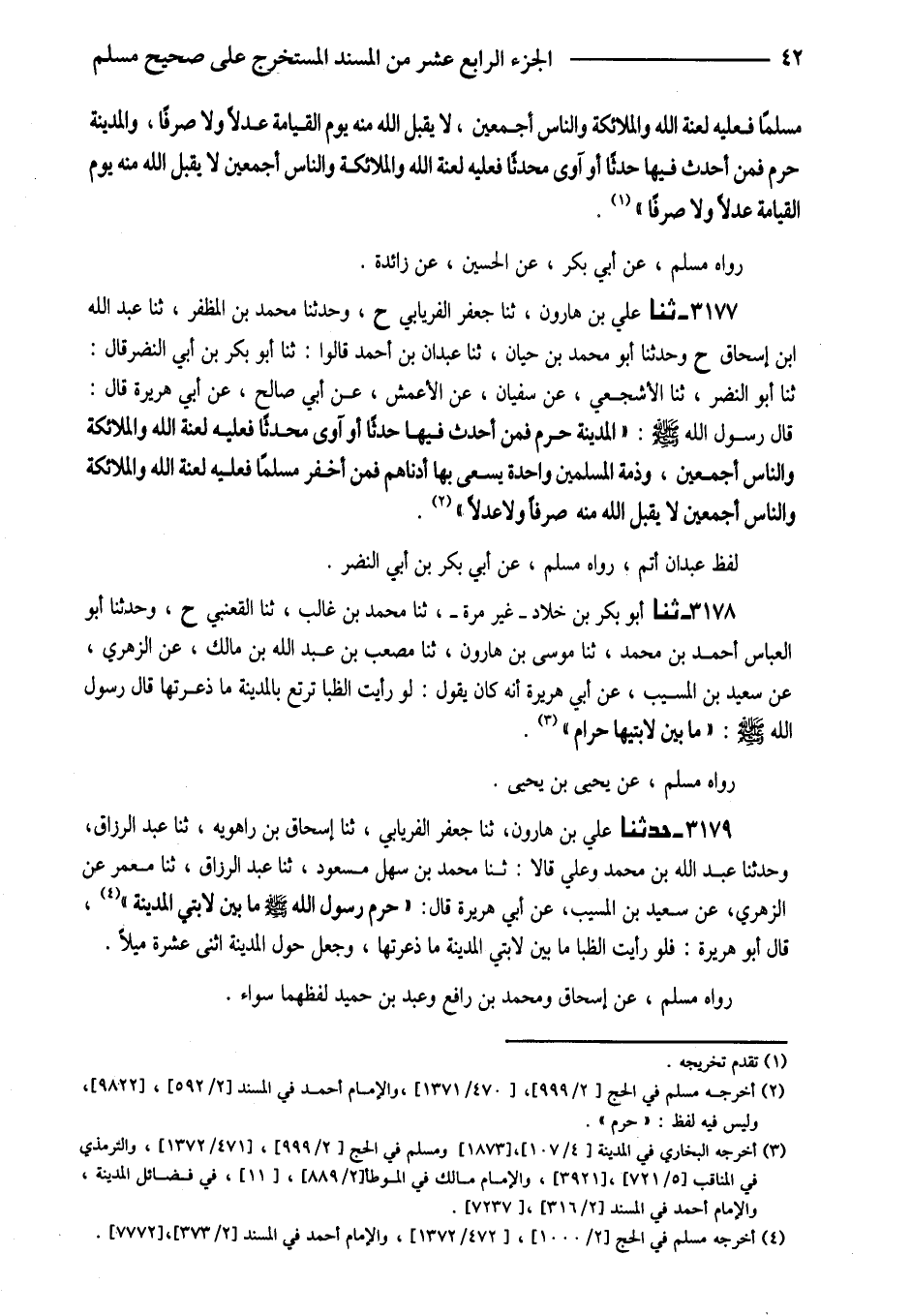 3177 - ثَنَا عَلِيُّ بْنُ هَارُونَ ثَنَا جَعْفَرٌ الْفِرْيَابِيُّ ح وَحَدَّثَنَا مُحَمَّدُ بْنُ المظفر ثَنَا عبد الله ابْن إِسْحَاقَ ح وَحَدَّثَنَا أَبُو مُحَمَّدِ بْنُ حَيَّانَ ثَنَا عَبْدَانُ بْنُ أَحْمَدَ قَالُوا ثَنَا أَبُو بَكْرِ بْنُ أَبِي النَّضْرِ قَالَ ثَنَا أَبُو النَّضْرِ ثَنَا الأَشْجَعِيُّ عَنْ سُفْيَانَ عَنِ الأَعْمَشِ عَنْ أَبِي صَالِحٍ عَنْ أَبِي هُرَيْرَةَ قَالَ قَالَ رَسُولُ اللَّهِ صَلَّى اللَّهُ عَلَيْهِ وَسَلَّمَ (الْمَدِينَةُ حَرَمٌ فَمَنْ أَحْدَثَ فِيهَا حَدَثًا أَوْ آوَى مُحْدِثًا فَعَلَيْهِ لَعْنَةُ اللَّهِ وَالْمَلائِكَةُ وَالنَّاسُ أَجْمَعِينَ وَذِمَّةُ الْمُسْلِمِينَ وَاحِدَةٌ يَسْعَى بِهَا أَدْنَاهُمْ فَمَنْ أَخْفَرَ مُسْلِمًا فَعَلَيْهِ لَعْنَةُ اللَّهِ وَالْمَلائِكَةُ وَالنَّاسُ أَجْمَعِينَ لَا يَقْبَلُ اللَّهُ مِنْهُ صَرْفًا وَلا عَدْلا)