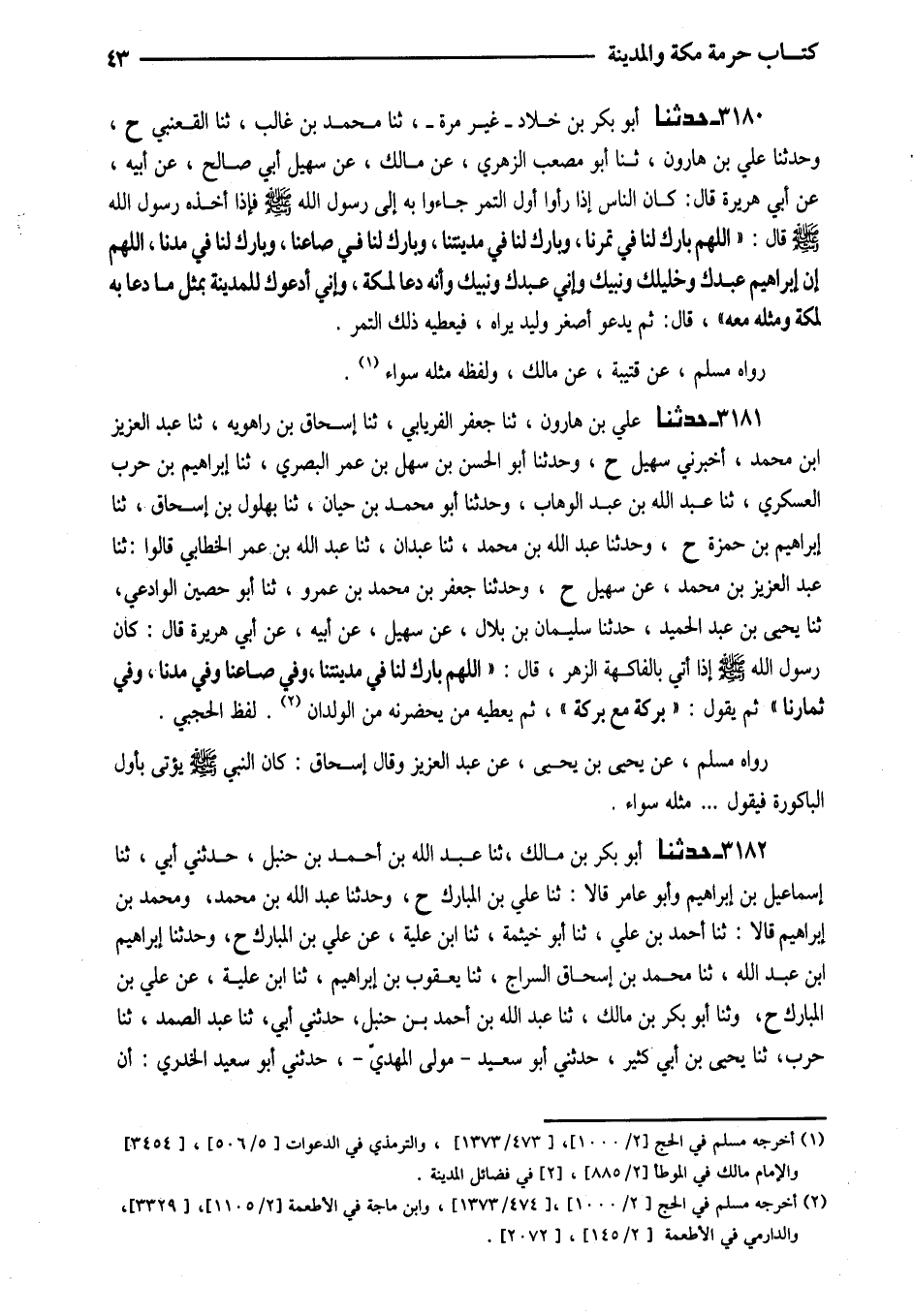 3181 - حَدَّثَنَا عَلِيُّ بْنُ هَارُونَ ثَنَا جَعْفَرٌ الْفِرْيَابِيُّ ثَنَا إِسْحَاقُ بْنُ رَاهَوَيْهِ ثَنَا عَبْدُ الْعَزِيزِ ابْن مُحَمَّدٍ أَخْبَرَنِي سُهَيْلٌ ح وَحَدَّثَنَا أَبُو الْحَسَنِ بْنُ سَهْلِ بْنِ عُمَرَ الْبَصْرِيُّ ثَنَا إِبْرَاهِيمُ بْنُ حَرْبٍ الْعَسْكَرِيُّ ثَنَا عَبْدُ اللَّهِ بْنُ عَبْدِ الْوَهَّابِ وَحَدَّثَنَا أَبُو مُحَمَّدِ بْنُ حَيَّانَ ثَنَا بُهْلُولُ بْنُ إِسْحَاقَ ثَنَا إِبْرَاهِيمُ بْنُ حَمْزَةَ ح وَحَدَّثَنَا عَبْدُ اللَّهِ بْنُ مُحَمَّدٍ ثَنَا عَبْدَانُ ثَنَا عَبْدُ اللَّهِ بْنُ عُمَرَ الْخَطَّابِيُّ قَالُوا ثَنَا عَبْدُ الْعَزِيزِ بْنُ مُحَمَّدٍ عَنْ سُهَيْلٍ ح وَحَدَّثَنَا جَعْفَرُ بْنُ مُحَمَّدِ بْنِ عَمْرٍو ثَنَا أَبُو حُصَيْنٍ الْوَادِعِيُّ ثَنَا يَحْيَى بْنُ عَبْدِ الْحَمِيدِ حَدَّثَنَا سُلَيْمَانُ بْنُ بِلالٍ عَنْ سُهَيْلٍ عَنْ أَبِيهِ عَنْ أَبِي هُرَيْرَةَ قَالَ كَانَ رَسُولُ اللَّهِ صَلَّى اللَّهُ عَلَيْهِ وَسَلَّمَ إِذَا أَتَى بِالْفَاكِهَةِ الزُّهْرِ قَالَ (اللَّهُمَّ بَارِكْ لَنَا فِي مَدِينَتِنَا وَفِي صَاعِنَا وَفِي مُدِّنَا وَفِي ثِمَارِنَا) ثُمَّ يَقُولُ (بَرَكَةٌ مَعَ بَرَكَةٍ) ثُمَّ يُعْطِيَهُ مَنْ يَحْضُرَنَّهُ مِنَ الْوِلْدَانِ لَفْظُ الْحَجَبِيِّ
