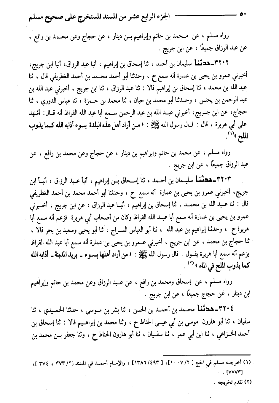 3202 - حَدَّثَنَا سُلَيْمَانُ بْنُ أَحْمَدَ ثَنَا إِسْحَاقُ بْنُ إِبْرَاهِيمَ أَنْبَأَ عَبْدُ الرَّزَّاقِ أَنْبَأَ ابْنُ جُرَيْجٍ أَخْبَرَنِي عَمْرُو بْنُ يَحْيَى بْنِ عُمَارَةَ أَنَّهُ سَمِعَ ح وَحَدَّثَنَا أَبُو أَحْمَدَ مُحَمَّدُ بْنُ أَحْمَدَ الْغِطْرِيفِيُّ قَالَ ثَنَا عَبْدُ اللَّهِ بْنُ مُحَمَّدٍ ثَنَا إِسْحَاقُ بْنُ إِبْرَاهِيمَ قَالا ثَنَا عَبْدُ الرَّزَّاقِ ثَنَا ابْنُ جُرَيْجٍ أَخْبَرَنِي عَبْدِ اللَّهِ بْنِ عَبْدِ الرَّحْمَنِ بْنِ يُحَنَّسَ وَحَدَّثَنَا أَبُو مُحَمَّدِ بْنُ حَيَّانَ ثَنَا مُحَمَّدُ بْنُ حَمْزَةَ ثَنَا عَبَّاسٌ الدُّورِيُّ ثَنَا حَجَّاجٌ عَنِ ابْنِ جُرَيْجٍ أَخْبَرَنِي عَبْدِ اللَّهِ بْنِ عَبْدِ الرَّحْمَنِ سَمِعَ أَبَا عَبْدِ اللَّهِ الْقَرَّاظَ أَنَّهُ قَالَ أَشْهَدُ عَلَى أَبِي هُرَيْرَةَ قَالَ قَالَ رَسُولُ اللَّهِ صَلَّى اللَّهُ عَلَيْهِ وَسَلَّمَ (مِنْ أَرَادَ أَهْلَ هَذِهِ الْبَلْدَةِ بِسُوءٍ أَذَابَهُ اللَّهُ كَمَا يَذُوبُ الْمِلْحُ)