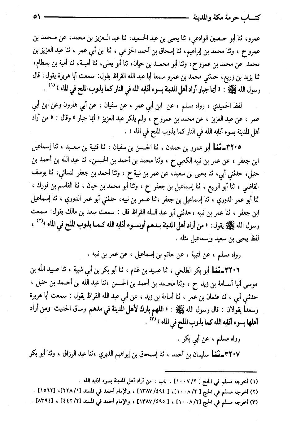 3205 - ثَنَا أَبُو عَمْرِو بْنُ حَمْدَانَ ثَنَا الْحَسَنُ بْنُ سُفْيَانَ ثَنَا قُتَيْبَةُ بْنُ سَعِيدٍ ثَنَا إِسْمَاعِيلُ ابْن جَعْفَرٍ عَنْ عُمَرَ بْنِ نُبَيْهٍ الْكَعْبِيِّ ح وَثنا مُحَمَّدُ بْنُ أَحْمَدَ بْنِ الْحَسَنِ ثَنَا عَبْدُ اللَّهِ بْنُ أَحْمَدَ بْنِ حَنْبَلٍ حَدَّثَنِي أَبِي ثَنَا يَحْيَى بْنُ سَعِيدٍ عَنْ عُمَرَ بْنِ نُبَيْهٍ ح وَثنا أَحْمَدُ بْنُ جَعْفَرِ النَّسَائِيُّ ثَنَا يُوسُفُ الْقَاضِي ثَنَا أَبُو الرَّبِيعِ ثَنَا إِسْمَاعِيلُ بْنُ جَعْفَرٍ ح وَثنا أَبُو مُحَمَّدِ بْنُ حَيَّانَ ثَنَا الْقَاسِمُ بْنُ فُورَكٍ ثَنَا أَبُو عُمَرَ الدُّورِيُّ ثَنَا إِسْمَاعِيلُ بْنُ جَعْفَرٍ ثَنَا عُمَرُ بْنُ نُبَيْهٍ حَدَّثَنِي أَبُو عمر الدوري ثَنَا إِسْمَاعِيل ابْن جَعْفَرٍ ثَنَا عُمَرُ بْنُ نُبَيْهٍ حَدَّثَنِي أَبُو عَبْدِ اللَّهِ الْقَرَّاظُ قَالَ سَمِعْتُ سَعْدَ بْنَ مَالِكٍ يَقُولُ سَمِعْتُ رَسُولَ اللَّهِ صَلَّى اللَّهُ عَلَيْهِ وَسَلَّمَ يَقُولُ (مَنْ أَرَادَ أَهْلَ الْمَدِينَةِ بِدَهْمٍ أَوْ بِسُوءٍ أَذَابَهُ اللَّهُ كَمَا يَذُوبُ الْمِلْحُ فِي الْمَاءِ)