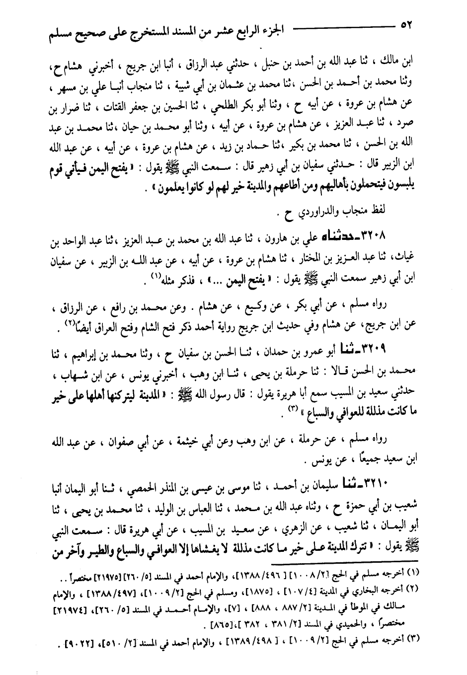 ابْنُ مَالِكٍ ثَنَا عَبْدُ اللَّهِ بْنُ أَحْمَدَ بْنِ حَنْبَلٍ حَدَّثَنِي عَبْدُ الرَّزَّاقِ أَنْبَأَ ابْنُ جُرَيْجٍ أَخْبَرَنِي هِشَامٌ ح وَثنا مُحَمَّدُ بْنُ أَحْمَدَ بْنِ الْحَسَنِ ثَنَا مُحَمَّدُ بْنُ عُثْمَانَ بْنِ أَبِي شَيْبَةَ ثَنَا مِنْجَابٌ أَنْبَأَ عَلِيُّ بْنُ مِسْهَرٍ عَنْ هِشَامِ بْنِ عُرْوَةَ عَنْ أَبِيهِ ح وَثنا أَبُو بَكْرٍ الطَّلْحِيُّ ثَنَا الْحُسَيْنُ بْنُ جَعْفَرٍ الْقَتَّاتُ ثَنَا ضِرَارُ بْنُ صُرَدٍ ثَنَا عَبْدُ الْعَزِيزِ عَنْ هِشَامِ بْنِ عُرْوَةَ عَنْ أَبِيهِ وَثنا أَبُو مُحَمَّدِ بْنُ حَيَّانَ ثَنَا مُحَمَّدُ بْنُ عَبْدِ اللَّهِ بْنِ الْحَسَنِ ثَنَا مُحَمَّدُ بْنُ بُكَيْرٍ ثَنَا حَمَّادُ بْنُ زَيْدٍ عَنْ هِشَامِ بْنِ عُرْوَةَ عَنْ أَبِيهِ عَنْ عَبْدِ اللَّهِ ابْن الزُّبَيْرِ قَالَ حَدَّثَنِي سُفْيَانُ بْنُ أَبِي زُهَيْرٍ قَالَ سَمِعْتُ النَّبِيَّ صَلَّى اللَّهُ عَلَيْهِ وَسَلَّمَ يَقُولُ (يفتح الْيمن فَيَأْتِي قوم يلبسُونَ فَيَتَحَمَّلُونَ بِأَهَالِيهِمْ وَمَنْ أَطَاعَهُمْ وَالْمَدِينَةُ خَيْرٌ لَهُمْ لَوْ كَانُوا يَعْلَمُونَ)