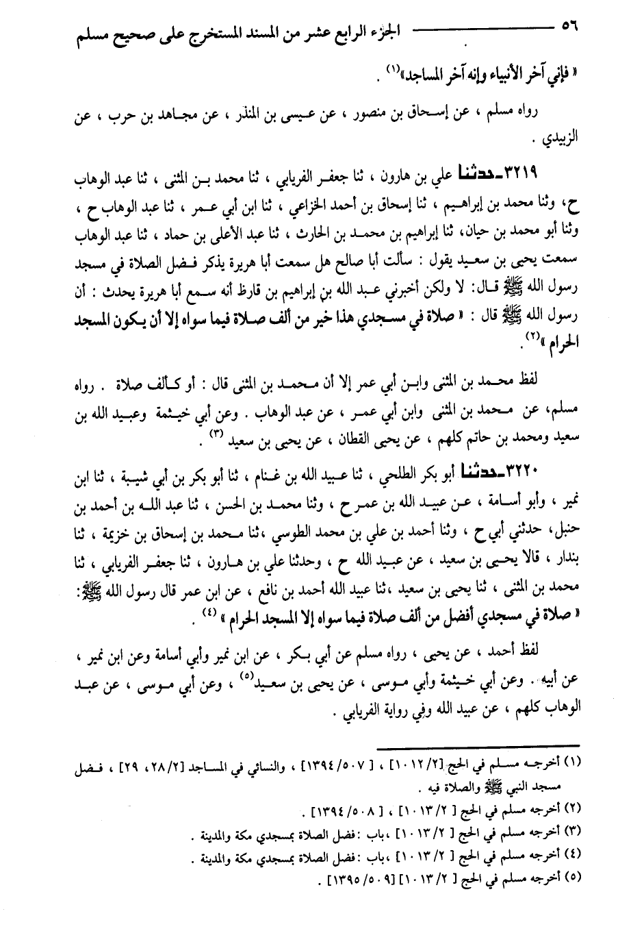 3220 - حَدَّثَنَا أَبُو بَكْرٍ الطَّلْحِيُّ ثَنَا عُبَيْدُ اللَّهِ بْنُ غَنَّامٍ ثَنَا أَبُو بَكْرِ بْنُ أَبِي شَيْبَةَ ثَنَا ابْنُ نُمَيْرٍ وَأَبُو أُسَامَةَ عَنْ عُبَيْدِ اللَّهِ بْنِ عُمَرَ ح وثنا مُحَمَّدُ بْنُ الْحَسَنِ ثَنَا عَبْدُ اللَّهِ بْنُ أَحْمَدَ بْنِ حَنْبَلٍ حَدَّثَنِي أَبِي ح وَثنا أَحْمَدُ بْنُ عَلِيِّ بْنِ مُحَمَّدٍ الطُّوسِيُّ ثَنَا مُحَمَّدُ بْنُ إِسْحَاقَ بْنِ خُزَيْمَةَ ثَنَا بُنْدَارٌ قَالا يَحْيَى بْنُ سَعِيدٍ عَنْ عُبَيْدِ اللَّهِ ح وَحَدَّثَنَا عَلِيُّ بْنُ هَارُونَ ثَنَا جَعْفَرٌ الْفِرْيَابِيُّ ثَنَا مُحَمَّدُ بْنُ الْمُثَنَّى ثَنَا يَحْيَى بْنُ سَعِيدٍ ثَنَا عُبَيْدُ الله أَحْمد بن نَافِعٍ عَنِ ابْنِ عُمَرَ قَالَ رَسُولُ اللَّهِ صَلَّى اللَّهُ عَلَيْهِ وَسَلَّمَ (صَلاةٌ فِي مَسْجِدِي أَفْضَلُ مِنْ أَلْفِ صَلاةٍ فِيمَا سِوَاهُ إِلَّا الْمَسْجِدَ الْحَرَامَ)