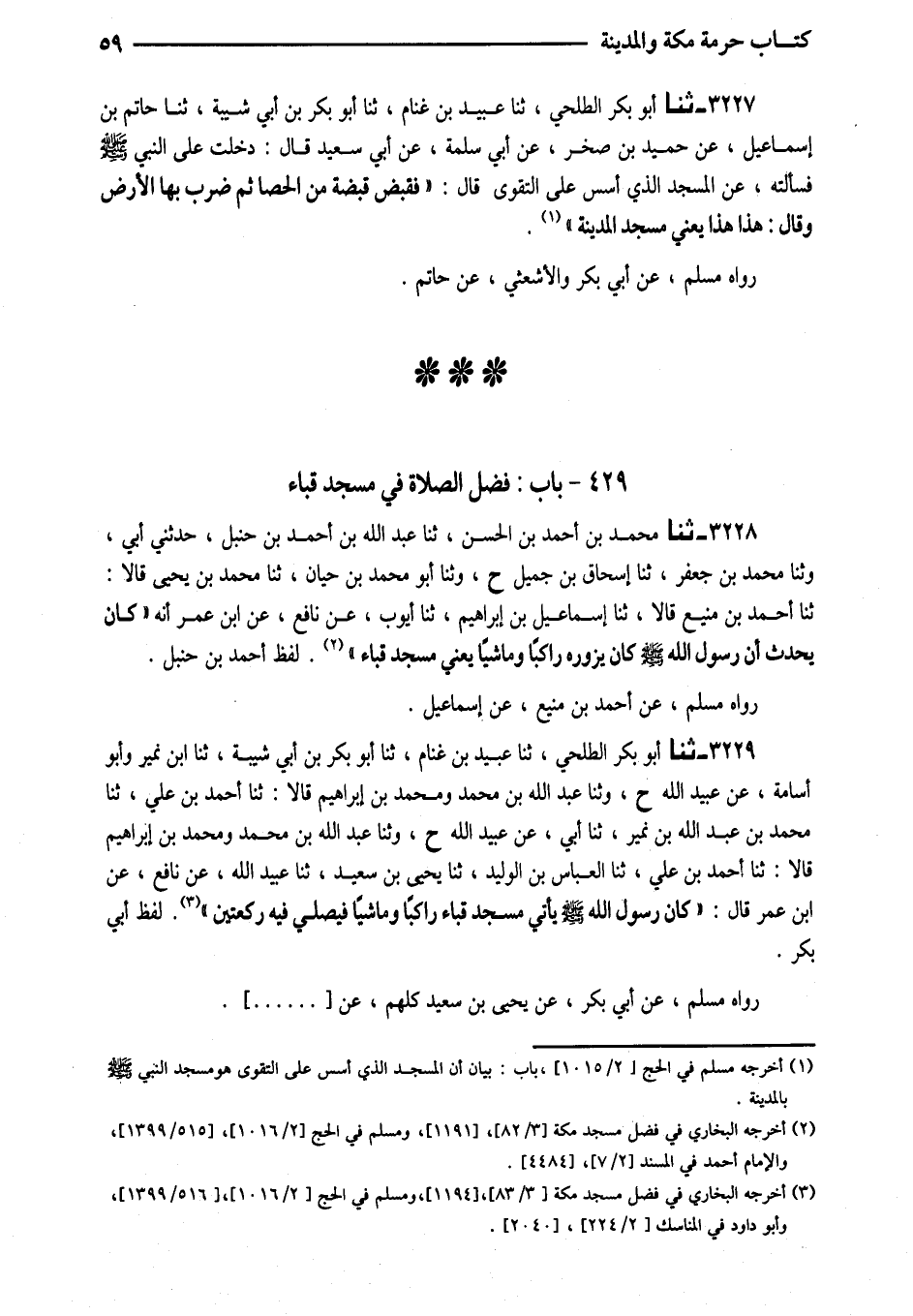 3229 - ثَنَا أَبُو بَكْرٍ الطَّلْحِيُّ ثَنَا عُبَيْدُ بْنُ غَنَّامٍ ثَنَا أَبُو بَكْرِ بْنُ أَبِي شَيْبَةَ ثَنَا ابْنُ نُمَيْرٍ وَأَبُو أُسَامَةَ عَنْ عُبَيْدِ اللَّهِ ح وَثَنَا عَبْدُ اللَّهِ بْنُ مُحَمَّدٍ وَمُحَمَّدُ بْنُ إِبْرَاهِيمَ قَالا ثَنَا أَحْمَدُ بْنُ عَلِيٍّ ثَنَا مُحَمَّدُ بْنُ عَبْدِ اللَّهِ بْنِ نُمَيْرٍ ثَنَا أَبِي عَنْ عُبَيْدِ اللَّهِ ح وَثنا عَبْدُ اللَّهِ بْنُ مُحَمَّدٍ وَمُحَمَّدُ بْنُ إِبْرَاهِيمَ قَالا ثَنَا أَحْمَدُ بْنُ عَلِيٍّ ثَنَا الْعَبَّاسُ بْنُ الْوَلِيدِ ثَنَا يَحْيَى بْنُ سَعِيدٍ ثَنَا عُبَيْدُ اللَّهِ عَنْ نَافِعٍ عَنِ ابْنِ عُمَرَ قَالَ (كَانَ رَسُولُ اللَّهِ صَلَّى اللَّهُ عَلَيْهِ وَسَلَّمَ يَأْتِي مَسْجِدَ قُبَاءَ رَاكِبًا وَمَاشِيًا فَيُصَلِّي فِيهِ رَكْعَتَيْنِ) لَفْظُ أَبِي بَكْرٍ