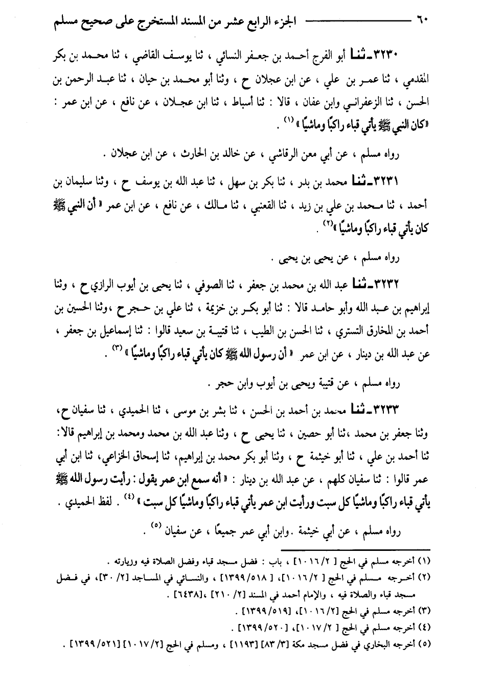 3233 - ثَنَا مُحَمَّدُ بْنُ أَحْمَدَ بْنِ الْحَسَنِ ثَنَا بِشْرُ بْنُ مُوسَى ثَنَا الْحُمَيْدِيُّ ثَنَا سُفْيَانُ ح وَثنا جَعْفَرُ بْنُ مُحَمَّدٍ ثَنَا أَبُو حُصَيْنٍ ثَنَا يَحْيَى ح وثنا عَبْدُ اللَّهِ بْنُ مُحَمَّدٍ وَمُحَمَّدُ بْنُ إِبْرَاهِيمَ قَالا ثَنَا أَحْمَدُ بْنُ عَلِيٍّ ثَنَا أَبُو خَيْثَمَةَ ح وثنا أَبُو بَكْر مُحَمَّدُ بْنُ إِبْرَاهِيمَ ثَنَا إِسْحَاقُ الْخُزَاعِيُّ ثَنَا ابْنُ أَبِي عُمَرَ قَالُوا ثَنَا سُفْيَانُ كُلُّهُمْ عَنْ عَبْدِ اللَّهِ بْنِ دِينَارٍ (أَنَّهُ سَمِعَ ابْنَ عُمَرَ يَقُولُ رَأَيْتُ رَسُولَ اللَّهِ صَلَّى اللَّهُ عَلَيْهِ وَسَلَّمَ يَأْتِي قُبَاءَ رَاكِبًا وَمَاشِيًا كُلَّ سَبْتٍ وَرَأَيْتُ ابْنَ عُمَرَ يَأْتِي قُبَاءَ رَاكِبًا وَمَاشِيًا كُلَّ سَبْتٍ) لَفْظُ الْحُمَيْدِيُّ