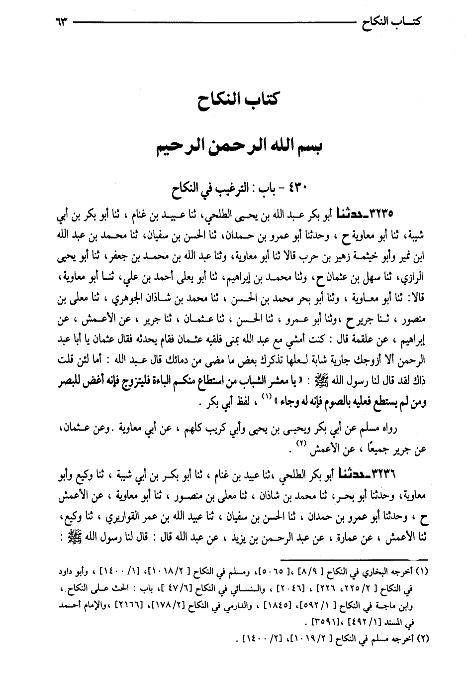 3235 - حَدَّثَنَا أَبُو بَكْرٍ عَبْدُ اللَّهِ بْنُ يَحْيَى الطَّلْحِيُّ ثَنَا عُبَيْدُ بْنُ غَنَّامٍ ثَنَا أَبُو بَكْرِ بْنُ أَبِي شَيْبَةَ ثَنَا أَبُو مُعَاوِيَةَ ح وَحَدَّثَنَا أَبُو عَمْرِو بْنُ حَمْدَانَ ثَنَا الْحَسَنُ بْنُ سُفْيَانَ ثَنَا مُحَمَّدُ بْنُ عَبْدِ الله ابْن نُمَيْرٍ وَأَبُو خَيْثَمَةَ زُهَيْرُ بْنُ حَرْبٍ قَالا ثَنَا أَبُو مُعَاوِيَةَ وَثَنَا عَبْدُ اللَّهِ بْنُ مُحَمَّدِ بْنِ جَعْفَرٍ ثَنَا أَبُو يَحْيَى الرَّازِيُّ ثَنَا سَهْلُ بْنُ عُثْمَانَ ح وَثَنَا مُحَمَّدُ بْنُ إِبْرَاهِيمَ ثَنَا أَبُو يَعْلَى أَحْمَدُ بْنُ عَليّ ثَنَا أَبُو مُعَاوِيَة قَالا ثَنَا أَبُو مُعَاوِيَةَ وَثنا أَبُو بَحْرٍ مُحَمَّدُ بْنُ الْحَسَنِ ثَنَا مُحَمَّدُ بْنُ شَاذَانَ الْجَوْهَرِيُّ ثَنَا مُعَلَّى بْنُ مَنْصُورٍ ثَنَا جَرِيرٌ ح وثنا أَبُو عَمْرِو ثَنَا الْحَسَنُ ثَنَا عُثْمَانُ ثَنَا جَرِيرٌ عَنِ الأَعْمَشِ عَنْ إِبْرَاهِيمَ عَنْ عَلْقَمَةَ قَالَ كُنْتُ أَمْشِي مَعَ عَبْدِ اللَّهِ بِمِنًى فَلَقِيَهُ عُثْمَانُ فَقَامَ يُحَدِّثُهُ فَقَالَ عُثْمَانُ يَا أَبَا عَبْدِ الرَّحْمَنِ أَلا أُزَوِّجُكَ جَارِيةً شَابَّةً لَعَلَّهَا تُذَكِّرُكَ بَعْضَ مَا مَضَى مِنْ دِمَائِكَ قَالَ عَبْدُ اللَّهِ أَمَا لَئِنْ قُلْتَ ذَاكَ لَقَدْ قَالَ لَنَا رَسُولُ اللَّهِ صَلَّى اللَّهُ عَلَيْهِ وَسَلَّمَ (يَا مَعْشَرَ الشَّبَابِ مَنِ اسْتَطَاعَ مِنْكُمُ الْبَاءَةَ فَلْيَتَزَوَّجْ فَإِنَّهُ أَغَضُّ لِلْبَصَرِ وَمَنْ لَمْ يَسْتَطِعْ فَعَلَيْهِ بِالصَّوْمِ فَإِنَّهُ لَهُ وِجَاءٌ) لَفْظُ أَبِي بَكْرٍ