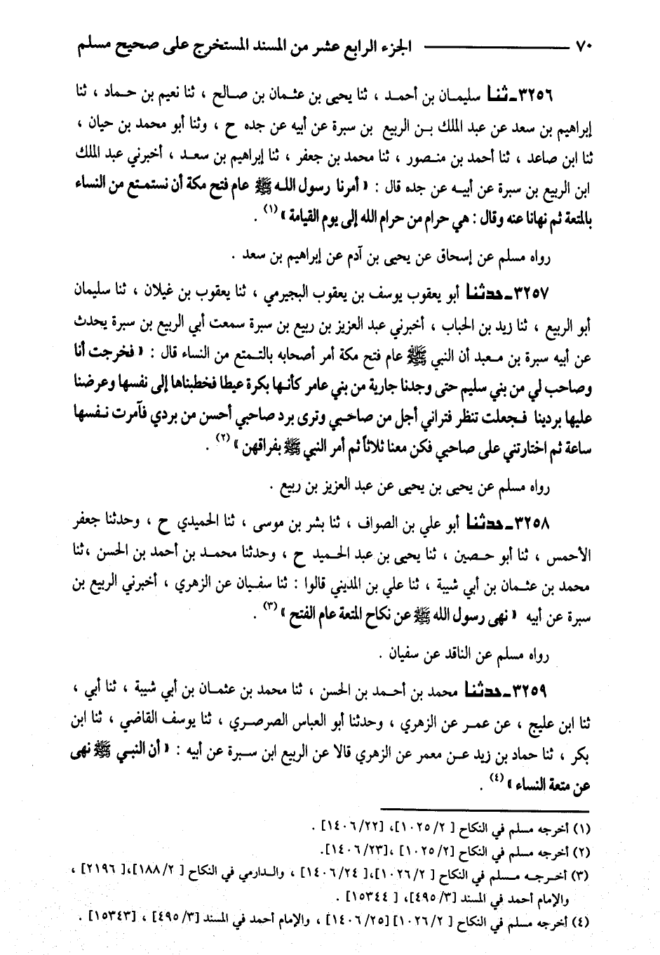 3258 - حَدَّثَنَا أَبُو عَلِيِّ بْنِ الصَّوَّافِ ثَنَا بِشْرُ بْنُ مُوسَى ثَنَا الْحُمَيْدِيُّ ح وَحَدَّثَنَا جَعْفَرٌ الأَحْمَسُ ثَنَا أَبُو حُصَيْنٍ ثَنَا يَحْيَى بْنُ عَبْدِ الْحَمِيدِ ح وَحَدَّثَنَا مُحَمَّدُ بْنُ أَحْمَدَ بْنِ الْحَسَنِ ثَنَا مُحَمَّدُ بْنُ عُثْمَانَ بْنِ أَبِي شَيْبَةَ ثَنَا عَلِيُّ بْنُ الْمَدِينِيِّ قَالُوا ثَنَا سُفْيَانُ عَنِ الزُّهْرِيِّ أَخْبَرَنِي الرَّبِيعُ بْنُ سَبْرَةَ عَنْ أَبِيهِ (نَهَى رَسُولُ اللَّهِ صَلَّى اللَّهُ عَلَيْهِ وَسَلَّمَ عَنْ نِكَاحِ الْمُتْعَةِ عَامَ الْفَتْحِ)