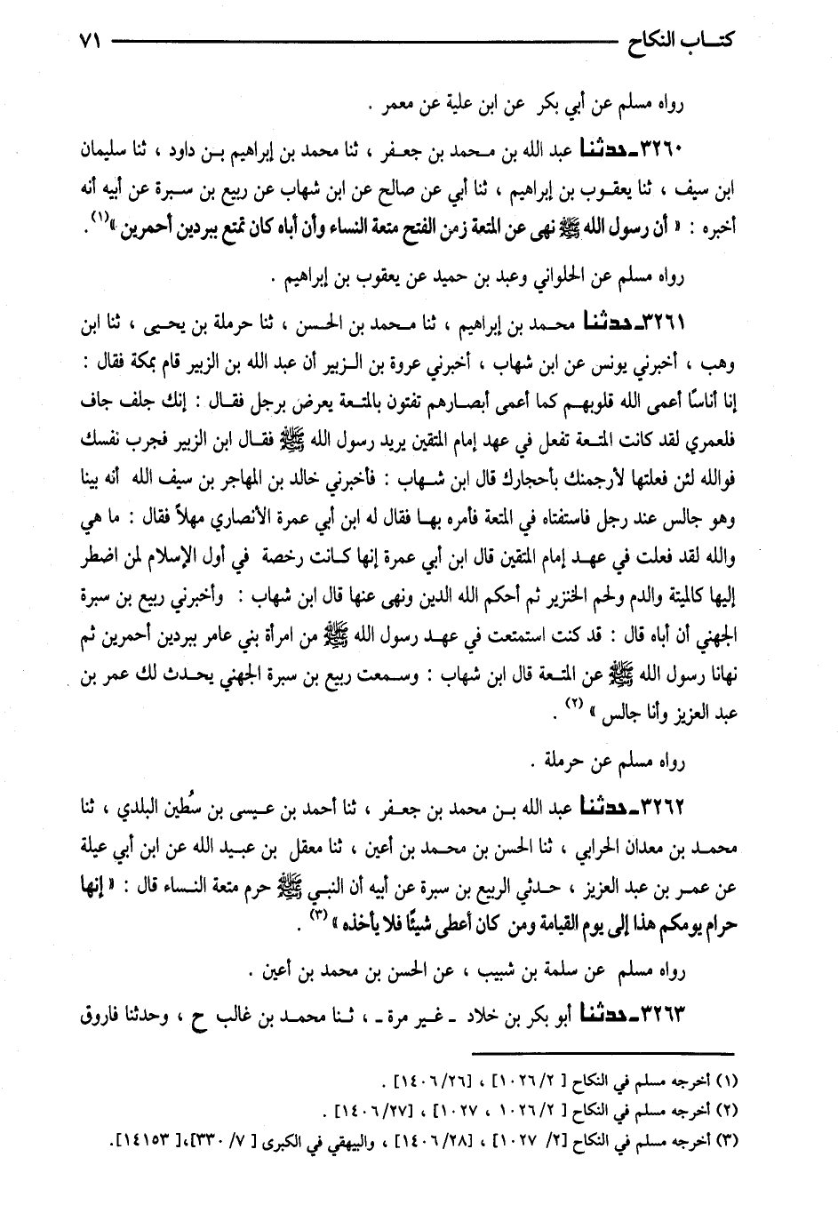 3261 - حَدَّثَنَا مُحَمَّدُ بْنُ إِبْرَاهِيمَ ثَنَا مُحَمَّدُ بْنُ الْحَسَنِ ثَنَا حَرْمَلَةُ بْنُ يَحْيَى ثَنَا ابْنُ وَهْبٍ أَخْبَرَنِي يُونُسُ عَنِ ابْنِ شِهَابٍ أَخْبَرَنِي عُرْوَةُ بْنُ الزُّبَيْرِ أَنَّ عَبْدَ اللَّهِ بْنَ الزُّبَيْرِ قَامَ بِمَكَّةَ فَقَالَ إِنَّا أُنَاسًا أَعْمَى اللَّهُ قُلُوبَهُمْ كَمَا أَعْمَى أَبْصَارَهُمْ تُفْتُونَ بِالْمُتْعَةِ يُعَرِّضُ بِرَجُلٍ فَقَالَ إِنَّكَ جِلْفٌ جَافٍ فَلَعَمْرِي لَقَدْ كَانَتِ الْمُتْعَةُ تُفْعَلُ فِي عَهْدِ إِمَامِ الْمُتَّقِينَ يُرِيدُ رَسُولُ اللَّهِ صَلَّى اللَّهُ عَلَيْهِ وَسَلَّمَ فَقَالَ ابْنُ الزُّبَيْرِ فَجَرِّبْ نَفْسَكَ فَوَاللَّهِ لَئِنْ فَعَلْتَهَا لَأَرْجُمَنَّكَ بِأَحْجَارِكَ قَالَ ابْنُ شِهَابٍ فَأَخْبَرَنِي خَالِدُ بْنُ الْمُهَاجِرِ بْنِ سَيْفِ اللَّهِ أَنَّهُ بَيْنَا وَهُوَ جَالِسٌ عِنْدَ رَجُلٍ فَاسْتَفْتَاهُ فِي الْمُتْعَةِ فَأَمَرَهُ بِهَا فَقَالَ لَهُ ابْنُ أَبِي عَمْرَةَ الأَنْصَارِيُّ مَهْلا فَقَالَ مَا هِيَ وَاللَّهِ لَقَدْ فَعَلْتُ فِي عَهْدِ إِمَامِ الْمُتَّقِينَ قَالَ ابْنُ أَبِي عَمْرَةَ إِنَّهَا كَانَتْ رُخْصَةً فِي أَوَّلِ الْإِسْلامِ لِمَنِ اضْطُرَّ إِلَيْهَا كَالْمَيْتَةِ وَالدَّمِ وَلَحْمِ الْخِنْزِيرِ ثُمَّ أَحْكَمَ اللَّهُ الدِّينَ وَنَهَى عَنْهَا قَالَ ابْنُ شِهَابٍ وَأَخْبَرَنِي رَبِيعُ بْنُ سَبْرَةَ الْجُهَنِيُّ أَنَّ أَبَاهُ قَالَ قَدْ كُنْتُ اسْتَمْتَعْتُ فِي عَهْدِ رَسُولِ اللَّهِ صَلَّى اللَّهُ عَلَيْهِ وَسَلَّمَ مِنِ امْرَأَةِ بَنِي عَامِرٍ بِبُرْدَيْنِ أَحْمَرَيْنِ ثُمَّ نَهَانَا رَسُولُ اللَّهِ صَلَّى اللَّهُ عَلَيْهِ وَسَلَّمَ عَنِ الْمُتْعَةِ قَالَ ابْنُ شِهَابٍ وَسَمِعْتُ رَبِيعَ بْنَ سَبْرَةَ الْجُهَنِيَّ يُحَدِّثُ لَكَ عُمَرُ بْنُ عَبْدِ الْعَزِيزِ وَأَنَا جَالِسٌ