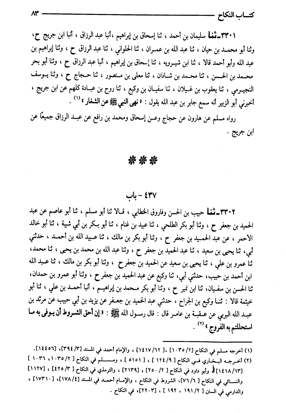 3302 - ثَنَا حَبِيبُ بْنُ الْحَسَنِ وَفَارُوقٌ الْخَطَّابِيُّ قَالا ثَنَا أَبُو مُسْلِمٍ ثَنَا أَبُو عَاصِمٍ عَنْ عَبْدِ الْحَمِيدِ بْنُ جَعْفَرٍ ح وَثنا أَبُو بَكْرٍ الطَّلْحِيُّ ثَنَا عُبَيْدُ بْنُ غَنَّامٍ ثَنَا أَبُو بَكْرِ بْنُ أَبِي شَيْبَةَ ثَنَا أَبُو خَالِدٍ الأَحْمَرُ عَنْ عَبْدِ الْحَمِيدِ بْنِ جَعْفَرٍ ح وَثنا أَبُو بَكْرٍ بْنُ مَالِكٍ ثَنَا عُبَيْدُ اللَّهِ بْنُ أَحْمَدَ حَدَّثَنِي أَبِي ثَنَا يَحْيَى بْنُ سَعِيدٍ ثَنَا عَبْدُ الْحَمِيدِ بْنِ جَعْفَرٍ ح وَثنا عَبْدُ اللَّهِ بْنُ مُحَمَّدِ بْنِ يحيى ثَنَا مُحَمَّد ثَنَا عَمْرُو بْنُ عَلِيٍّ ثَنَا يَحْيَى بْنُ سَعِيدٍ عَنِ الْحُمَيْدِ بْنُ جَعْفَرٍ ح وَثنا أَبُو بَكْرِ بْنُ مَالِكٍ ثَنَا عَبْدُ الله ابْن أَحْمَدَ بْنِ حَبِيبٍ حَدَّثَنِي أَبِي ثَنَا وَكِيعٌ عَنْ عَبْدِ الْحَمِيدِ بْنُ جَعْفَرٍ ح وَثنا أَبُو عَمْرِو بْنُ حَمْدَانَ ثَنَا الْحَسَنُ بْنُ سُفْيَانَ ثَنَا ابْنُ نُمَيْرٍ ح وَثَنَا أَبُو بَكْرٍ مُحَمَّدُ بْنُ إِبْرَاهِيمَ أَنْبَأَ أَحْمَدُ بْنُ عَلِيٍّ ثَنَا أَبُو خَيْثَمَةَ قَالا ثَنَا وَكِيعُ بْنُ الْجَرَّاحِ حَدَّثَنِي عَبْدُ الْحَمِيدِ بْنُ جَعْفَرٍ عَنْ يَزِيدَ بْنِ أَبِي حَبِيبٍ عَنْ مرْثَد بن عبد الله البربي عَنْ عُقْبَةَ بْنِ عَامِرٍ قَالَ قَالَ رَسُولُ اللَّهِ صَلَّى اللَّهُ عَلَيْهِ وَسَلَّمَ (إِنَّ أَحَقَّ الشُّرُوطِ أَنْ يُوَفَّى بِهِ مَا اسْتَحْلَلْتُمْ بِهِ الْفُرُوجَ)
