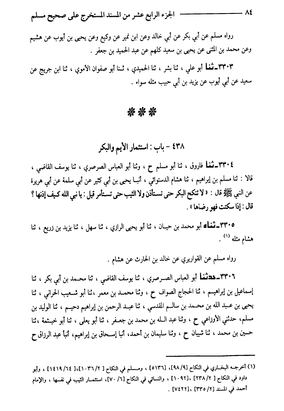 3304 - ثَنَا فَارُوقٌ ثَنَا أَبُو مُسْلِمٍ ح وَثنا أَبُو الْعَبَّاسِ الصَّرْصَرِيُّ ثَنَا يُوسُفُ الْقَاضِي قَالا ثَنَا مُسْلِمُ بْنُ إِبْرَاهِيمَ ثَنَا هِشَامٌ الدَّسْتُوَائِيُّ أَنْبَأَ يَحْيَى بْنُ أَبِي كَثِيرٍ عَنْ أَبِي سَلَمَةَ عَنْ أَبِي هُرَيْرَةَ عَنِ النَّبِيِّ صَلَّى اللَّهُ عَلَيْهِ وَسَلَّمَ قَالَ (لَا تُنْكَحُ الْبِكْرُ حَتَّى تُسْتَأْذَنَ وَلا الثَّيِّبُ حَتَّى تُسْتَأْمَرَ قِيلَ يَا نَبِيَّ اللَّهِ كَيْفَ إِذْنُهَا قَالَ إِذَا سَكَتَتْ فَهُوَ رِضَاهَا)