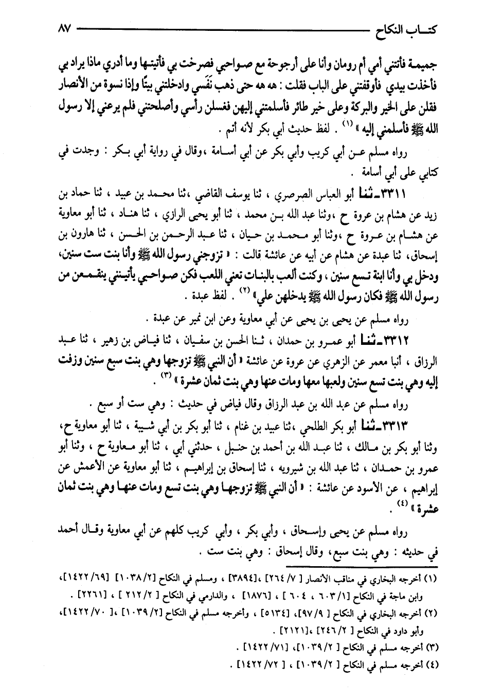 رَوَاهُ مُسْلِمٌ عَنْ يَحْيَى وَإِسْحَاقَ وَأَبِي بَكْرٍ وَأَبِي كُرَيْبٍ كُلُّهُمْ عَنْ أَبِي مُعَاوِيَةَ وَقَالَ أَحْمَدُ فِي حَدِيثِهِ وَهِيَ بِنْتُ سَبْعٍ وَقَالَ إِسْحَاقُ وَهِيَ بِنْتُ سِتٍّ