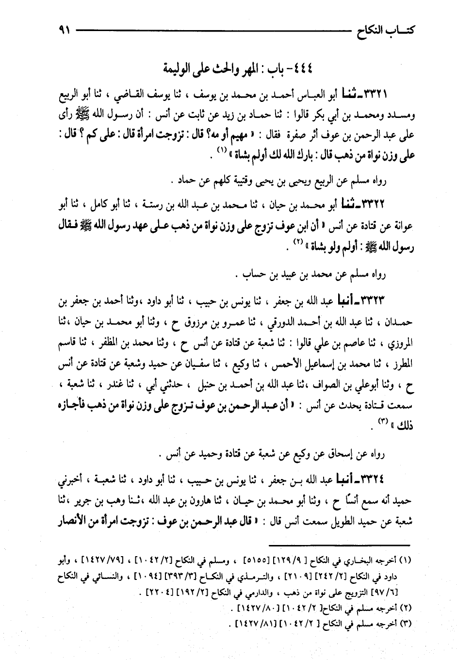 3323 - أَنْبَأَ عَبْدُ اللَّهِ بْنُ جَعْفَرٍ ثَنَا يُونسُ بْنُ حَبِيبٍ ثَنَا أَبُو دَاوُدَ وَثنا أَحْمَدُ بْنُ جَعْفَرِ بْنِ حَمْدَانَ ثَنَا عَبْدُ اللَّهِ بْنُ أَحْمَدَ الدَّوْرَقِيُّ ثَنَا عَمْرُو بْنُ مَرْزُوقٍ ح وَثنا أَبُو مُحَمَّدِ بْنُ حَيَّانَ ثَنَا الْمَرْوَزِيُّ ثَنَا عَاصِمُ بْنُ عَلِيٍّ قَالُوا ثَنَا شُعْبَةُ عَنْ قَتَادَةَ عَنْ أَنَسٍ ح وَثنا مُحَمَّدُ بْنُ الْمُظَفَّرِ ثَنَا قَاسِمٌ الْمُطَرِّزُ ثَنَا مُحَمَّدُ بْنُ إِسْمَاعِيلَ الأَحْمَسُ ثَنَا وَكِيعٌ ثَنَا سُفْيَانُ عَنْ حُمَيْدٍ وَشُعْبَةَ عَنْ قَتَادَةَ عَنْ أَنَسٍ ح وثنا أَبُو عَلِيِّ بْنُ الصَّوَّافِ ثَنَا عَبْدُ اللَّهِ بْنُ أَحْمَدَ بْنِ حَنْبَلٍ حَدَّثَنِي أَبِي ثَنَا غُنْدَرٌ ثَنَا شُعْبَةُ سَمِعْتُ قَتَادَةَ يُحَدِّثُ عَنْ أَنَسٍ (أَنَّ عَبْدَ الرَّحْمَنِ بْنِ عَوْفٍ تَزَوَّجَ عَلَى وَزْنِ نَوَاةٍ مِنْ ذَهَبٍ فَأَجَازَهُ ذَلِكَ)