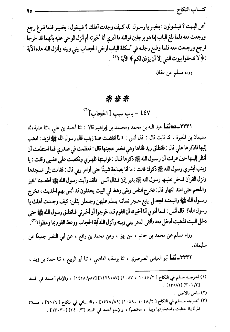 3331 - حَدَّثَنَا عَبْدُ اللَّهِ بْنُ مُحَمَّدٍ وَمُحَمَّدُ بْنُ إِبْرَاهِيمَ قَالا ثَنَا أَحْمَدُ بْنُ عَلِيٍّ ثَنَا هُدْبَةُ ثَنَا سُلَيْمَانُ بْنُ الْمُغِيرَةَ ثَنَا ثَابِتٌ قَالَ قَالَ أَنَسٌ (لَمَّا انْقَضَتْ عِدَّةُ زَيْنَبَ قَالَ رَسُولُ اللَّهِ صَلَّى اللَّهُ عَلَيْهِ وَسَلَّمَ لِزَيْدٍ اذْهَبْ إِلَيْهَا فَاذْكُرْهَا عَلَيَّ قَالَ فَانْطَلَقَ زَيْدٌ فَأَتَاهَا وَهِيَ تُخَمِّرُ عَجِينَهَا قَالَ فَعَظُمَتْ فِي صَدْرِي فَمَا اسْتَطَعْتُ أَنْ أَنْظُرَ إِلَيْهَا حِينَ عَرَفْتُ أَنَّ رَسُولَ اللَّهِ صَلَّى اللَّهُ عَلَيْهِ وَسَلَّمَ ذَكَرَهَا قَالَ فَوَلَّيْتُهَا ظَهْرِي وَنَكَصْتُ عَلَى عَقِبِي وَقُلْتُ يَا زَيْنَبُ أَبْشِرِي رَسُولُ اللَّهِ صَلَّى اللَّهُ عَلَيْهِ وَسَلَّمَ ذَكَرَكِ قَالَتْ مَا أَنَا بِصَانِعَةٍ شَيْئًا حَتَّى أُوَامِرَ رَبِّي قَالَ فَقَامَتْ إِلَى مَسْجِدِهَا وَنَزَلَ الْقُرْآنُ فَدَخَلَ عَلَيْهَا رَسُولُ اللَّهِ صَلَّى اللَّهُ عَلَيْهِ وَسَلَّمَ بِغَيْرِ إِذْنٍ فَقَالَ أَنَسٌ فَلَقَدْ رَأَيْتُ رَسُولَ اللَّهِ صَلَّى اللَّهُ عَلَيْهِ وَسَلَّمَ أَطْعَمَنَا الْخُبْزَ وَاللَّحْمَ حَتَّى امْتَدَّ النَّهَارُ قَالَ فَخَرَجَ النَّاسُ وَبَقِيَ رَهْطٌ فِي الْبَيْتِ يُحَدِّثُونَ قَدْ أَنَسَ بِهِمُ الْحَدِيثُ فَخَرَجَ رَسُولُ اللَّهِ صَلَّى اللَّهُ عَلَيْهِ وَسَلَّمَ وَاتَّبَعْتُهُ فَجَعَلَ يَتْبَعُ حُجَرَ نِسَائِهِ يُسَلِّمُ عَلَيْهِنَّ وَجَعَلْنَ يَقُلْنَ كَيْفَ وَجَدْتَ أَهْلَكَ يَا رَسُولَ اللَّهِ قَالَ أَنَسٌ فَمَا أَدْرِي أَنَا أَخْبَرْتُهُ أَنَّ الْقَوْمَ قَدْ خَرَجُوا أَوْ أَخْبَرَنِي فَانْطَلَقَ رَسُولُ اللَّهِ صَلَّى اللَّهُ عَلَيْهِ وَسَلَّمَ حَتَّى دَخَلَ الْبَيْتَ فَذَهَبْتُ أَدْخُلُ مَعَهُ فَأَلْقَى السِّتْرَ بَيْنِي وَبَيْنَهُ وَأَنْزَلَ اللَّهُ آيَةَ الْحِجَابِ وَوُعِظَ الْقَوْمُ بِمَا وُعِظُوا)