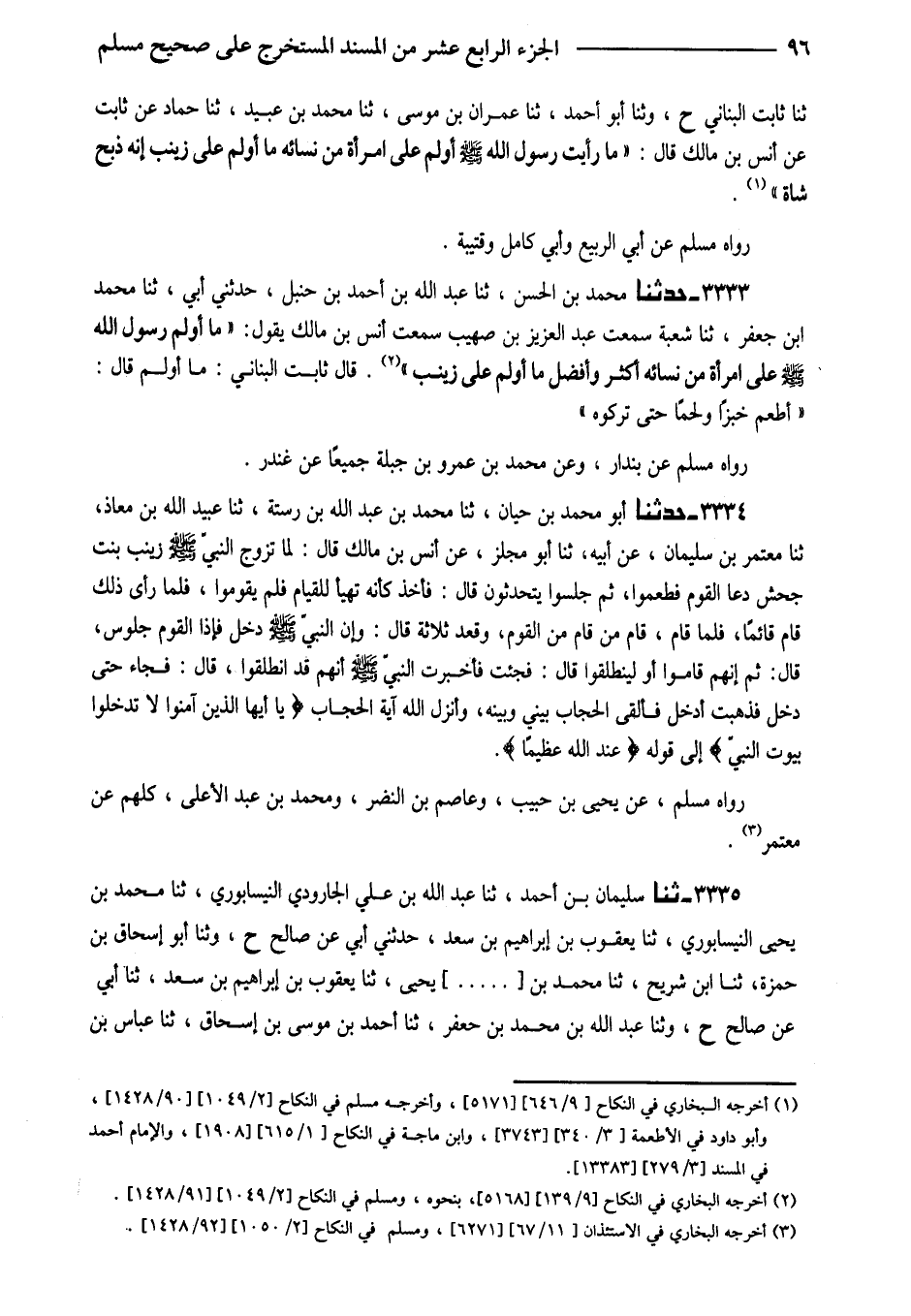 3333 - حَدَّثَنَا مُحَمَّدُ بْنُ الْحَسَنِ ثَنَا عَبْدُ اللَّهِ بْنُ أَحْمَدَ بْنِ حَنْبَلٍ حَدَّثَنِي أَبِي ثَنَا مُحَمَّد ابْن جَعْفَرٍ ثَنَا شُعْبَةُ سَمِعْتُ عَبْدَ الْعَزِيزِ بْنَ صُهَيْبٍ سَمِعْتُ أَنَسَ بْنَ مَالِكٍ يَقُولُ (مَا أَوْلَمَ رَسُولُ اللَّهِ صَلَّى اللَّهُ عَلَيْهِ وَسَلَّمَ عَلَى امْرَأَةٍ مِنْ نِسَائِهِ أَكْثَرَ وَأَفْضَلَ مَا أَوْلَمَ عَلَى زَيْنَبَ) قَالَ ثَابِتٌ الْبُنَانِيُّ مَا أَوْلَمَ قَالَ أَطْعَمَ خُبْزًا وَلَحْمًا حَتَّى تَرَكُوهُ
