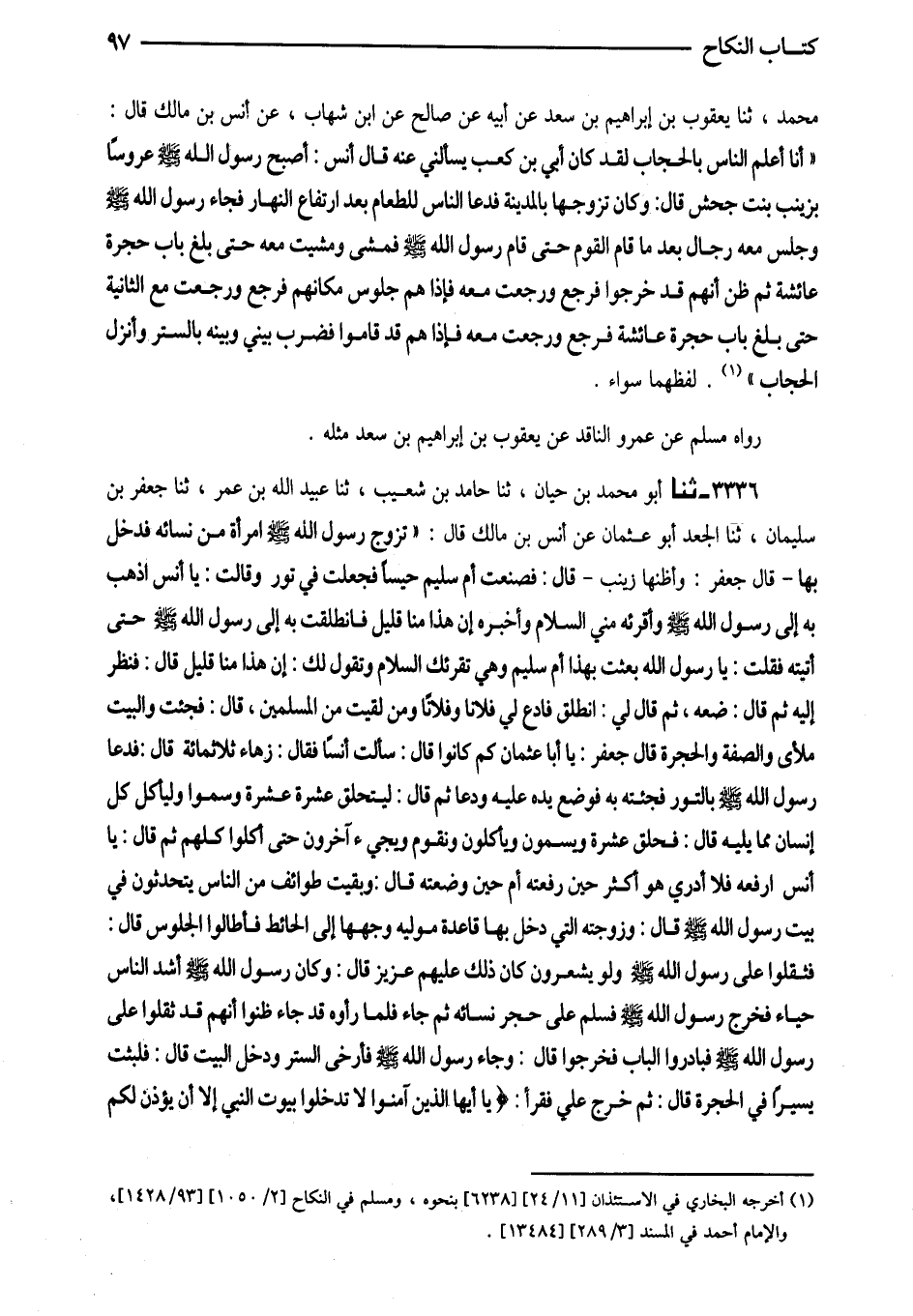 مُحَمَّدٍ ثَنَا يَعْقُوبُ بْنُ إِبْرَاهِيمَ بْنِ سَعْدٍ عَنْ أَبِيهِ عَنِ صَالِحٍ عَنِ ابْنِ شِهَابٍ عَنْ أَنَسِ بْنِ مَالِكٍ قَالَ (أَنَا أَعْلَمُ النَّاسِ بِالْحِجَابِ لَقَدْ كَانَ أُبَيُّ بْنُ كَعْبٍ يَسْأَلُنِي عَنْهُ قَالَ أَنَسٌ أَصْبَحَ رَسُولُ اللَّهِ صَلَّى اللَّهُ عَلَيْهِ وَسَلَّمَ عَرُوسًا بِزَيْنَبَ بِنْتِ جَحْشٍ قَالَ وَكَانَ تَزَوَّجَهَا بِالْمَدِينَةِ فَدَعَا النَّاسَ لِلطَّعَامِ بَعْدَ ارْتِفَاعِ النَّهَارِ فَجَاءَ رَسُولُ اللَّهِ صَلَّى اللَّهُ عَلَيْهِ وَسَلَّمَ وَجَلَسَ مَعَهُ رِجَالٌ بَعْدَ مَا قَامَ الْقَوْمُ حَتَّى قَامَ رَسُولُ اللَّهِ صَلَّى اللَّهُ عَلَيْهِ وَسَلَّمَ فَمَشَى وَمَشَيْتُ مَعَهُ حَتَّى بَلَغَ بَابَ حُجْرَةِ عَائِشَةَ ثُمَّ ظَنَّ أَنَّهُمْ قَدْ خَرَجُوا فَرَجَعَ وَرَجَعْتُ مَعَهُ فَإِذَا هُمْ جُلُوسٌ مَكَانَهُمْ فَرَجَعَ وَرَجَعْتُ مَعَ الثَّانِيَةِ حَتَّى بَلَغَ بَابَ حُجْرَةِ عَائِشَةَ فَرَجَعَ وَرَجَعْتُ مَعَهُ فَإِذَا هُمْ قَدْ قَامُوا فَضُرِبَ بَيْنِي وَبَيْنَهُ بِالسِّتْرِ وَأُنْزِلَ الْحِجَابُ) لَفْظُهُمَا سَوَاءٌ