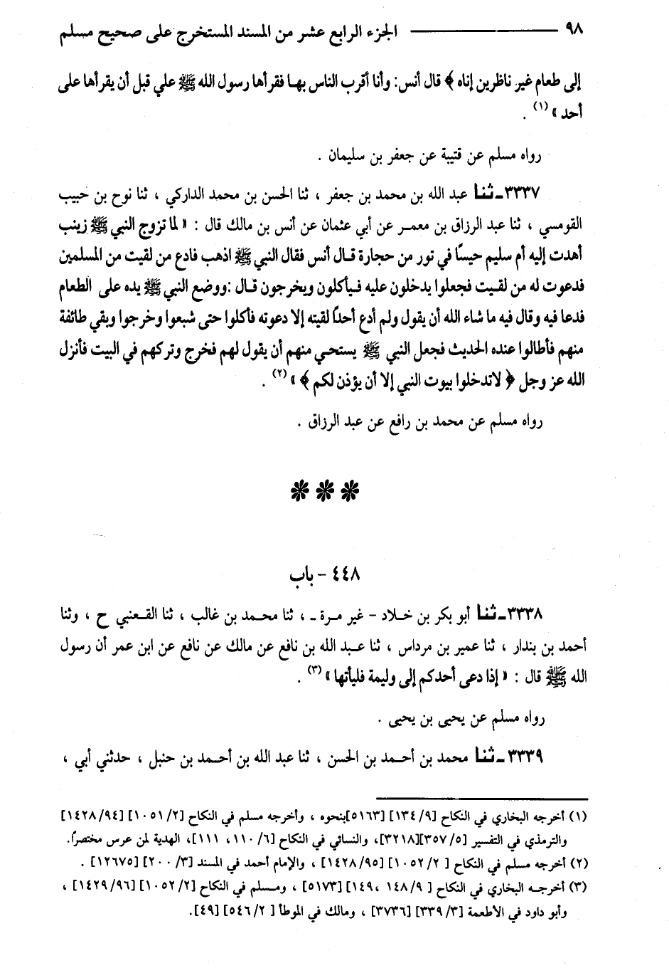 3337 - ثَنَا عَبْدُ اللَّهِ بْنُ مُحَمَّدِ بْنِ جَعْفَرٍ ثَنَا الْحَسَنُ بْنُ مُحَمَّدٍ الدَّارِكِيُّ ثَنَا نُوحُ بْنُ حَبِيبٍ الْقُومِسِيُّ ثَنَا عبد الرَّزَّاق بن معمر عَن أبي عُثْمَان عَن أَنَسُ بْنُ مَالِكٍ قَالَ (لَمَّا تَزَوَّجَ النَّبِيُّ صَلَّى اللَّهُ عَلَيْهِ وَسَلَّمَ زَيْنَبَ أَهْدَتْ إِلَيْهِ أُمُّ سُلَيْمٍ حَيْسًا فِي تَوْرٍ مِنْ حِجَارَةٍ قَالَ أَنَسٌ فَقَالَ النَّبِيُّ صَلَّى اللَّهُ عَلَيْهِ وَسَلَّمَ اذْهَبْ فَادْعُ مَنْ لَقِيتَ مِنَ الْمُسْلِمِينَ فَدَعَوْتُ لَهُ مَنْ لَقِيتُ فَجَعَلُوا يَدْخُلُونَ عَلَيْهِ فَيَأْكُلُونَ وَيَخْرُجُونَ قَالَ وَوَضَعَ النَّبِيُّ صَلَّى اللَّهُ عَلَيْهِ وَسَلَّمَ يَدَهُ عَلَى الطَّعَامِ فَدَعَا فِيهِ وَقَالَ فِيهِ مَا شَاءَ اللَّهُ أَنْ يَقُولَ وَلَمْ أَدْعُ أَحَدًا لَقِيتُهُ إِلَّا دَعَوْتُهُ فَأَكَلُوا حَتَّى شَبِعُوا وَخَرَجُوا وَبَقِيَ طَائِفَةٌ مِنْهُمْ فَأَطَالُوا عِنْدَهُ الْحَدِيثَ فَجَعَلَ النَّبِيِّ صَلَّى اللَّهُ عَلَيْهِ وَسَلَّمَ يَسْتَحْيِ مِنْهُمْ أَنْ يَقُولَ لَهُمْ فَخَرَجَ وَتَرَكَهُمْ فِي الْبَيْتِ فَأَنْزَلَ اللَّهُ عَزَّ وَجَلَّ {لَا تَدْخُلُوا بُيُوتَ النَّبِيِّ إِلا أَنْ يُؤْذَنَ لكم}