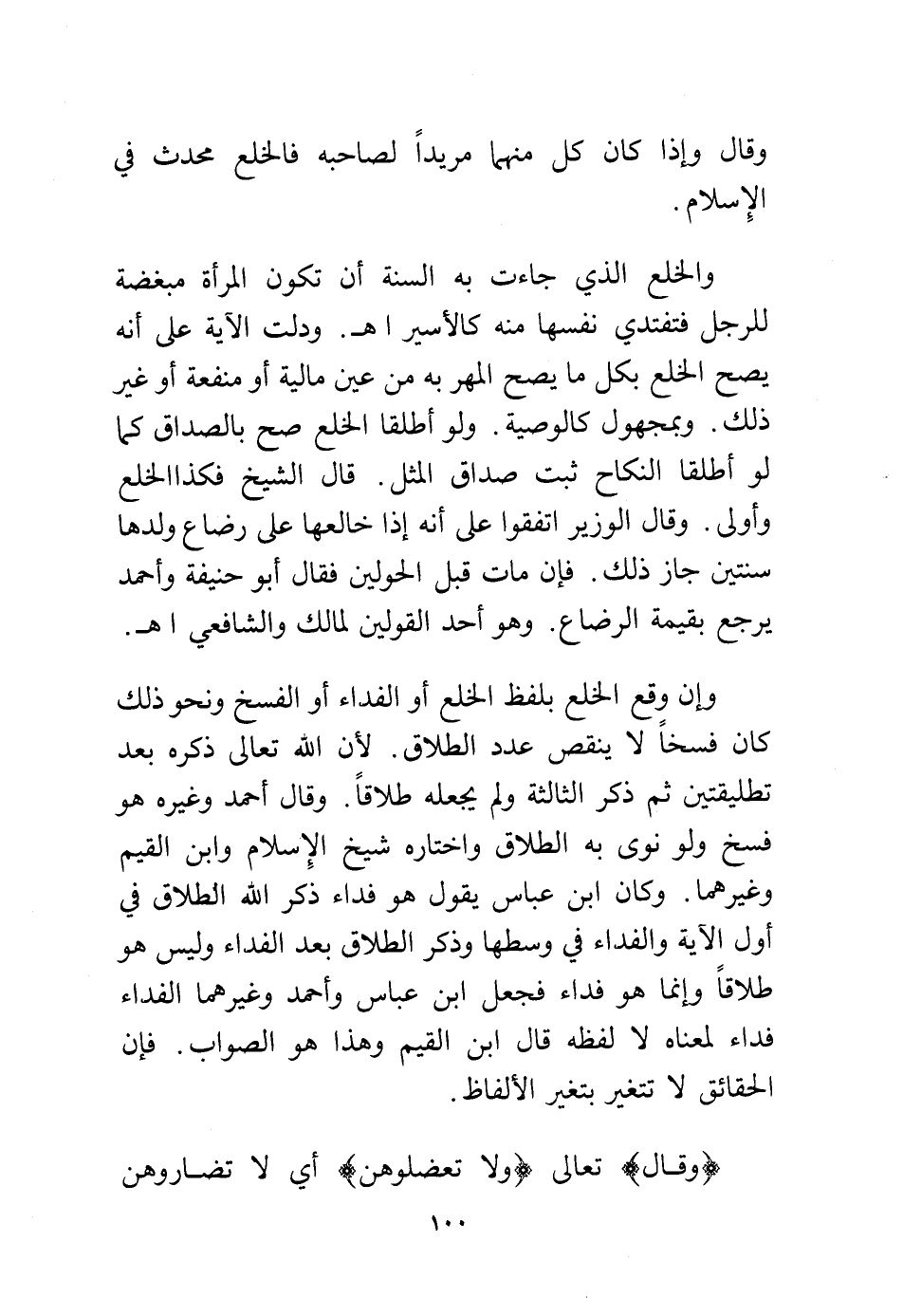 وإن وقع الخلع بلفظ الخلع أو الفداء أو الفسخ ونحو ذلك كان فسخًا لا ينقص عدد الطلاق، لأن الله تعالى ذكره بعد تطليقتين ثم ذكر الثالثة ولم يجعله طلاقًا، وقال أحمد وغيره هو فسخ ولو نوى به الطلاق واختاره شيخ الإسلام وابن القيم وغيرهما، وكان ابن عباس يقول هو فداء ذكر الله الطلاق في أول الآية والفداء في وسطها وذكر الطلاق بعد الفداء وليس هو طلاقًا وإنما هو فداء فجعل ابن عباس وأحمد وغيرهما الفداء فداء لمعناه لا لفظه قال ابن القيم وهذا هو الصواب، فإن الحقائق لا تتغير بتغير الألفاظ.