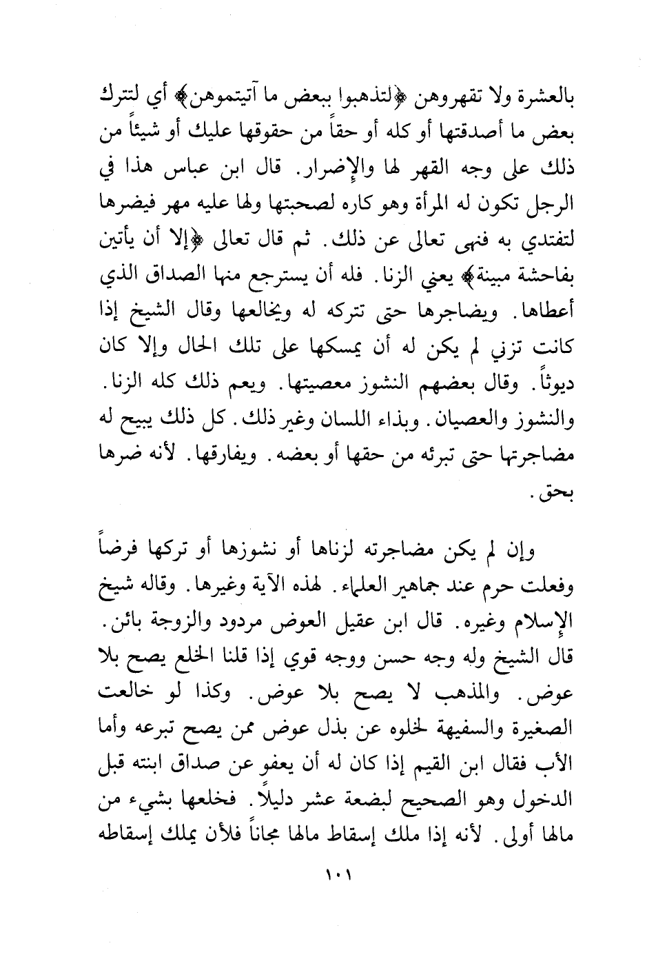 وإن لم يكن مضاجرته لزناها أو نشوزها أو تركها فرضًا وفعلت حرم عند جماهير العلماء، لهذه الآية وغيرها، وقاله شيخ الإسلام وغيره، قال ابن عقيل العوض مردود والزوجة بائن.
