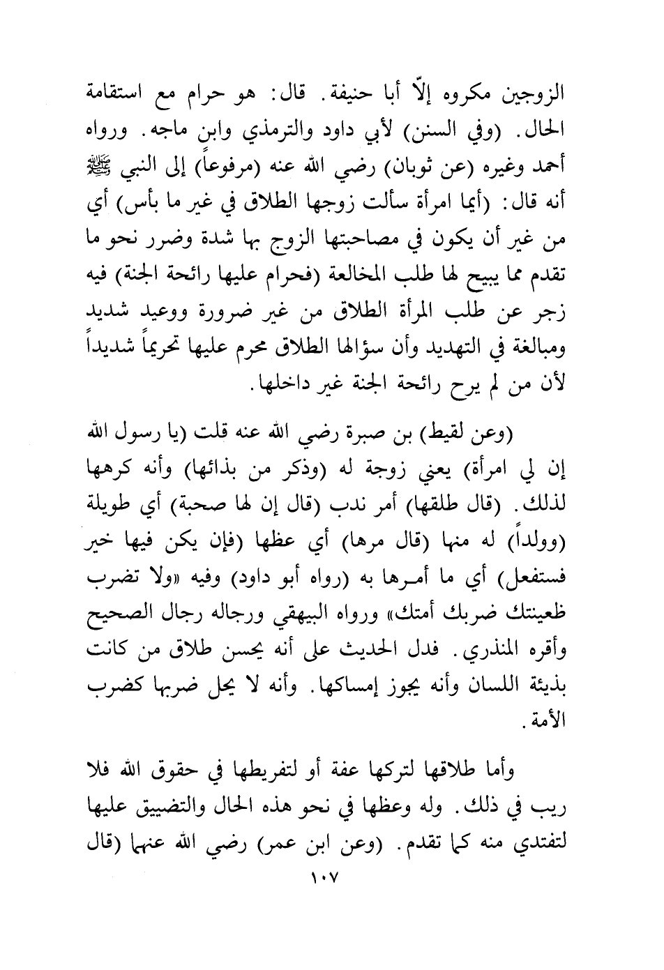 الزوجين مكروه إلا أبا حنيفة، قال: هو حرام مع استقامة الحال. (وفي السنن) لأبي داود والترمذي وابن ماجه، ورواه أحمد وغيره (عن ثوبان) رضي الله عنه (مرفوعًا) إلى النبي - صلى الله عليه وسلم - أنه قال: (أيما امرأة سألت زوجها الطلاق في غير ما بأس) أي من غير أن يكون في مصاحبتها الزوج بها شدة وضرر نحو ما تقدم مما يبيح لها طلب المخالعة (فحرام عليها رائحة الجنة) فيه زجر عن طلب المرأة الطلاق من غير ضرورة ووعيد شديد ومبالغة في التهديد وأن سؤالها الطلاق محرم عليها تحريمًا شديدًا لأنه من لم يرح رائحة الجنة غير داخلها.