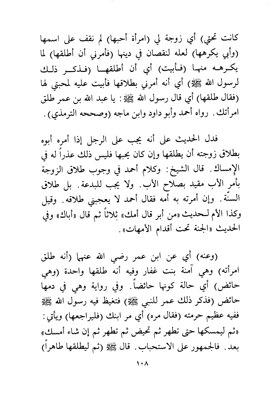 كانت تحتي) أي زوجة لي (امرأة أحبها) لم نقف على اسمها (وأبي يكرهها) لعله لنقصان في دينها (فأمرني أن أطلقها) لما يكرهه منها (فأبيت) أي أن أطلقها (فذكر ذلك لرسول الله - صلى الله عليه وسلم -) أي أنه أمرني بطلاقها فأبيت عليه لمحبتي لها (فقال طلقها) أي قال رسول الله - صلى الله عليه وسلم -: يا عبد الله بن عمر طلق امرأتك، رواه أحمد وأبو داود وابن ماجه (وصححه الترمذي).