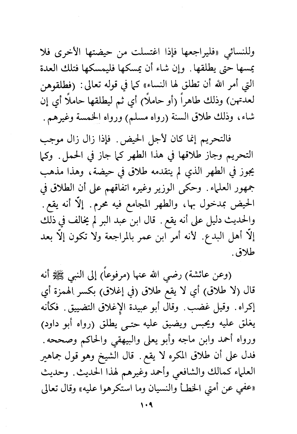 وعن عائشة رضي الله عنها (مرفوعًا) إلى النبي - صلى الله عليه وسلم - أنه قال: «لا طلاق» أي لا يقع طلاق (في إغلاق) بكسر الهمزة أي إكراه، وقيل غضب، وقال أبو عبيدة الإغلاق التضييق، فكأنه يغلق عليه ويحبس ويضيق عليه حتى يطلق (رواه أبو داود) ورواه أحمد وابن ماجه، وأبو يعلى والبيهقي والحاكم وصححه، فدل على أن طلاق المكره لا يقع، قال الشيخ وهو قول جماهير العلماء كمالك والشافعي وأحمد وغيرهم لهذا الحديث، وحديث «عفي