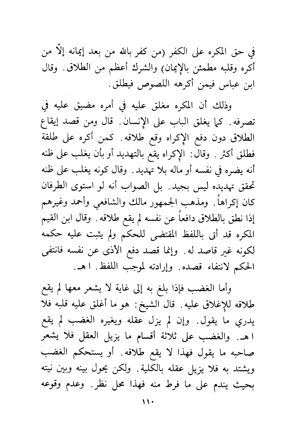 وذلك أن المكره مغلق عليه في أمره مضيق عليه في تصرفه، كما يغلق الباب على الإنسان قال، ومن قصد إيقاع الطلاق دون دفع الإكراه وقع طلاقه، كمن أكره على طلقة فطلق أكثر، وقال: الإكراه يقع بالتهديد أو بأن يغلب على ظنه أنه يضره في نفسه أو ماله بلا تهديد، وقال كونه يغلب على ظنه تحقق تهديده ليس بجيد، بل الصواب أنه لو استوى الطرفان كان إكراهًا.