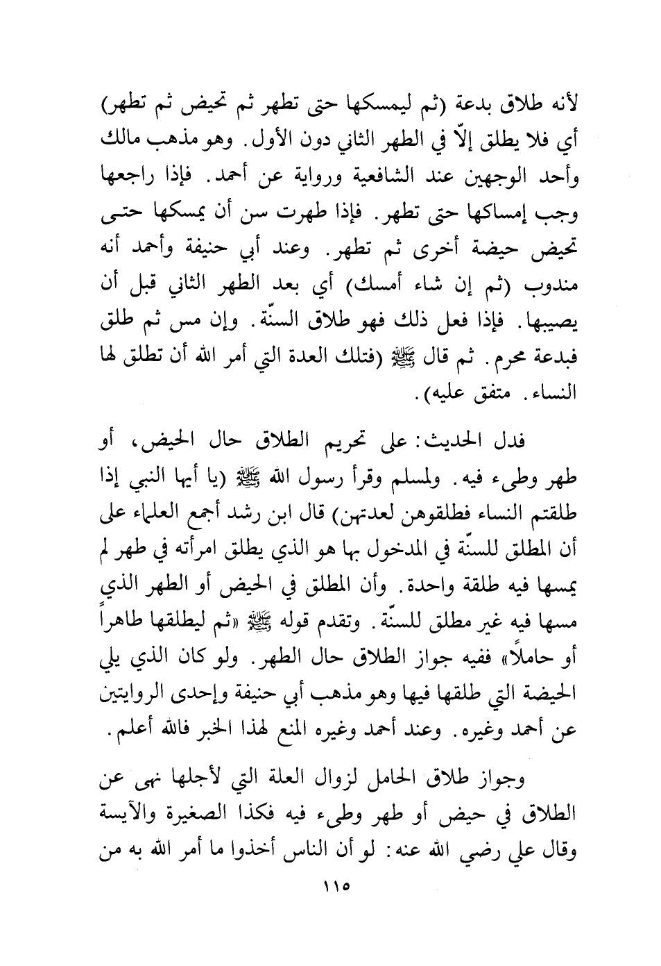 فدل الحديث على تحريم الطلاق حال الحيض، أو طهر وطئ فيه، ولمسلم وقرأ رسول الله - صلى الله عليه وسلم - {يَا أَيُّهَا النَّبِيُّ إِذَا طَلَّقْتُمُ النِّسَاءَ فَطَلِّقُوهُنَّ لِعِدَّتِهِنَّ} قال ابن رشد أجمع العلماء على أن المطلق للسنة في المدخول بها هو الذي يطلق امرأته في طهر لم يمسها فيه طلقة واحدة.