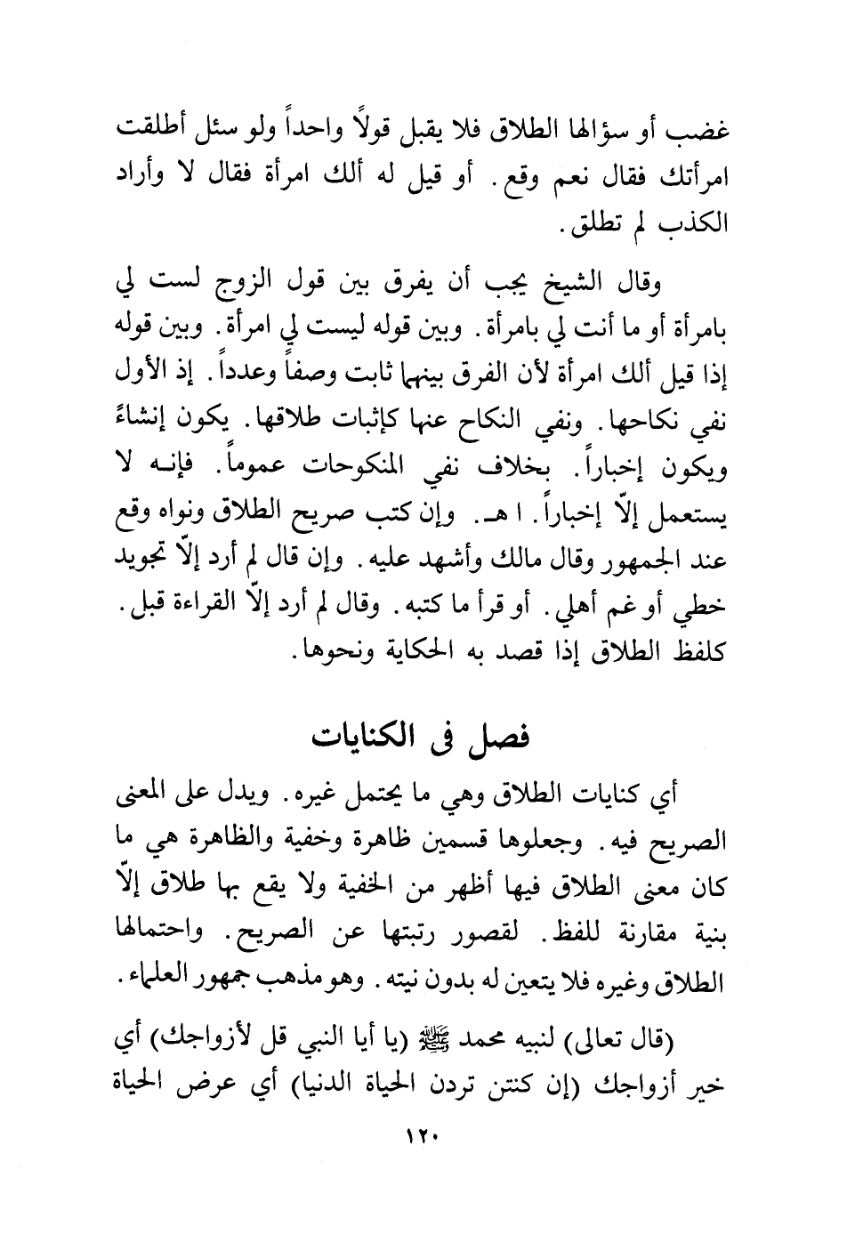 أي كنايات الطلاق وهي ما يحتمل غيره. ويدل على المعنى الصريح فيه. وجعلوها قسمين ظاهرة وخفية والظاهرة هي ما كان معنى الطلاق فيها أظهر من الخفية ولا يقع بها طلاق إلا بنية مقارنة للفظ. لقصور رتبتها عن الصريح. واحتمالها الطلاق وغيره فلا يتعين له بدون نيته. وهو مذهب جمهور العلماء.