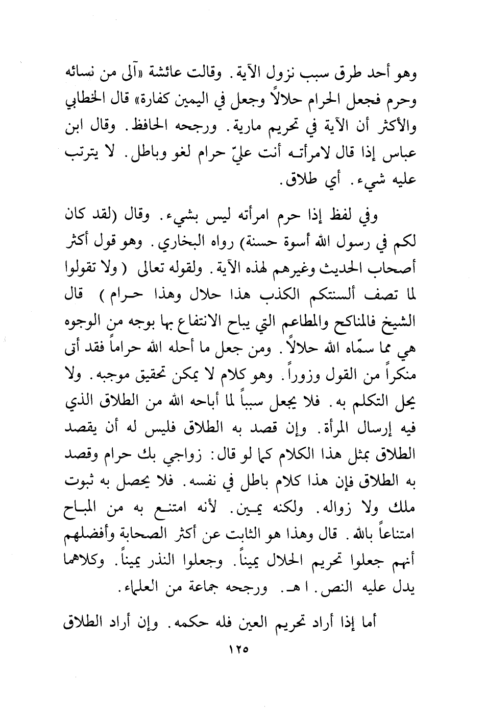 وفي لفظ إذا حرم امرأته ليس بشيء، وقال {لَقَدْ كَانَ لَكُمْ فِي رَسُولِ اللهِ أُسْوَةٌ حَسَنَةٌ} رواه البخاري، وهو قول أكثر أصحاب الحديث وغيرهم لهذه الآية، ولقوله تعالى: {وَلَا تَقُولُوا لِمَا تَصِفُ أَلْسِنَتُكُمُ الْكَذِبَ هَذَا حَلَالٌ وَهَذَا حَرَامٌ}.