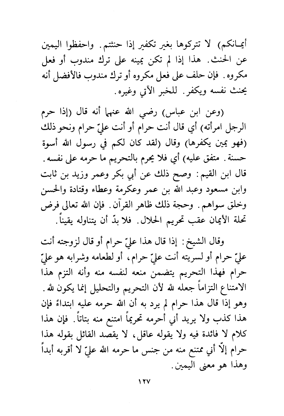 وقال الشيخ: إذا قال هذا علي حرام أو قال لزوجته أنت علي حرام أو لسريته أنت علي حرام، أو لطعامه وشرابه هو علي حرام فهذا التحريم يتضمن منعه لنفسه منه وأنه التزم هذا الامتناع التزامًا جعله لله لأن التحريم والتحليل إنما يكون لله، وهو إذا قال هذا حرام لم يرد به أن الله حرمه عليه ابتداء فإن هذا كذب ولا يريد أني أحرمه تحريمًا امتنع منه بتاتًا، فإن هذا كلام لا فائدة فيه ولا يقوله عاقل، لا يقصد القائل بقوله هذا حرام إلا أني ممتنع منه من جنس ما حرمه الله علي لا أقربه أبدًا وهذا هو معنى اليمين.