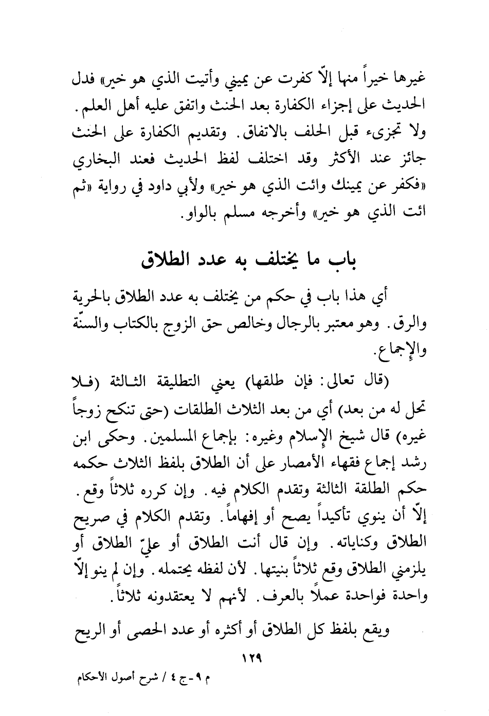 غيرها خيرًا منها إلا كفرت عن يميني وأنت الذي هو خير» فدل الحديث على إجزاء الكفارة بعد الحنث واتفق عليه أهل العلم، ولا تجزئ قبل الحلف بالاتفاق، وتقديم الكفارة على الحنث جائز عند الأكثر وقد اختلف لفظ الحديث فعند البخاري "فكفر عن يمينك وائت الذي هو خير" ولأبي داود في رواية "ثم ائت الذي هو خير" وأخرجه مسلم بالواو.