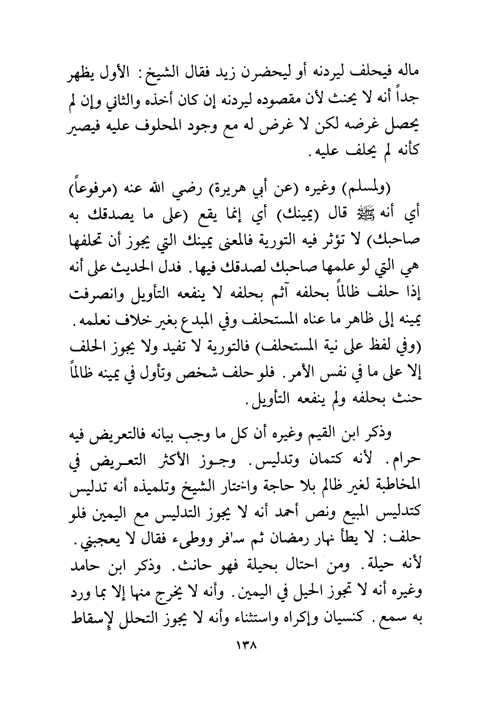 وذكر ابن القيم وغيره أن كل ما وجب بيانه فالتعريض فيه حرام، لأنه كتمان وتدليس، وجوز الأكثر التعريض في المخاطبة لغير ظالم بلا حاجة واختار الشيخ وتلميذه أنه تدليس كتدليس المبيع ونص أحمد أنه لا يجوز التدليس مع اليمين فلو حلف: لا يطأ نهار رمضان ثم سافر ووطئ فقال لا يعجبني لأنه حيلة، ومن احتال بحيلة فهو حانث، وذكر ابن حامد وغيره أنه لا تجوز الحيل في اليمين، وأنه لا يخرج منها إلا بما ورد به سمع، كنسيان وإكراه واستثناء، وأنه لا يجوز التحلل لإسقاط