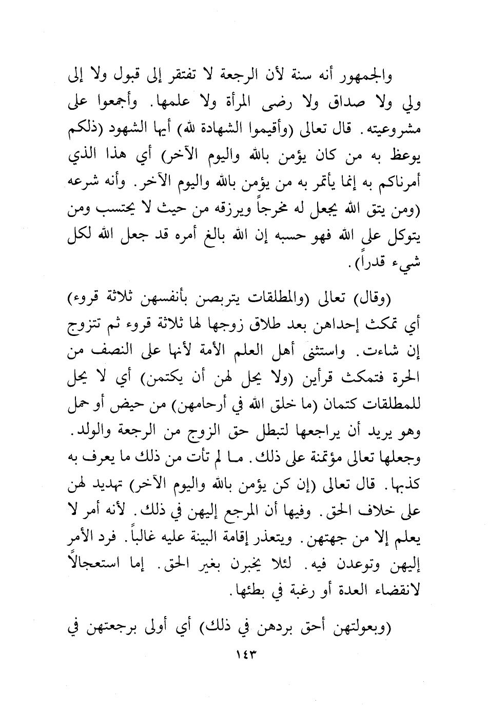 (وقال) تعالى: {وَالْمُطَلَّقَاتُ يَتَرَبَّصْنَ بِأَنْفُسِهِنَّ ثَلَاثَةَ قُرُوءٍ} أي تمكث إحداهن بعد طلاق زوجها لها ثلاثة قروء ثم تتزوج إن شاءت، واستثنى أهل العلم الأمة لأنها على النصف من الحرة فتمكث قرءين {وَلَا يَحِلُّ لَهُنَّ أَنْ يَكْتُمْنَ} أي لا يحل للمطلقات كتمان {مَا خَلَقَ اللهُ فِي أَرْحَامِهِنَّ} من حيض أو حمل وهو يريد أن يراجعها لتبطل حق الزوج من الرجعة والولد، وجعلها تعالى مؤتمنة على ذلك، ما لم تأت من ذلك ما يعرف به كذبها.