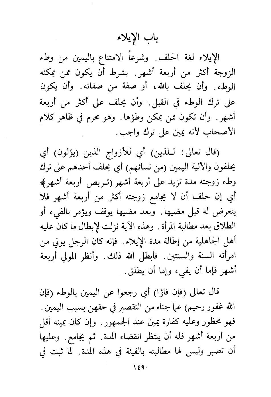 (قال تعالى: {لِلَّذِينَ} أي للأزواج الذين {يُؤْلُونَ} أي يحلفون والألية اليمين {مِنْ نِسَائِهِمْ} أي يحلف أحدهم على ترك وطء زوجته مدة تزيد على أربعة أشهر {تَرَبُّصُ أَرْبَعَةِ أَشْهُرٍ} أي إن حلف أن لا يجامع زوجته أكثر من أربعة أشهر فلا يتعرض له قبل مضيها، وبعد مضيها يوقف ويؤمر بالفيء أو الطلاق بعد مطالبة المرأة، وهذه الآية نزلت لإبطال ما كان عليه أهل الجاهلية من إطالة مدة الإيلاء، فإنه كان الرجل يولي من امرأته السنة والسنتين، فأبطل الله ذلك، وانظر المولي أربعة أشهر فإما أن يفيء وإما أن يطلق.