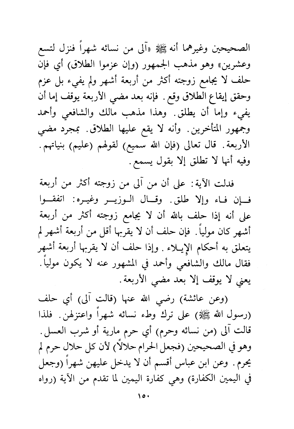 فدلت الآية: على أن من آلى من زوجته أكثر من أربعة فإن فاء وإلا طلق، وقال الوزير وغيره، اتفقوا على أنه إذا حلف بالله أن لا يجامع زوجته أكثر من أربعة أشهر كان موليًا فإن حلف أن لا يقربها أقل من أربعة أشهر لم يتعلق به أحكام الإيلاء، وإذا حلف أن لا يقربها أربعة أشهر فقال مالك والشافعي وأحمد في المشهور عنه لا يكون موليًا، يعني لا يوقف إلا بعد مضي الأربعة.